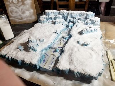 This was designed to not only test our mettle with building miniature terrain, but also in creating seasonal terrain. You can only barely see the sparkle in the crisp, fresh snow, but I’ll be sure to upload a video soon to show just how ‘wintery’ it is.