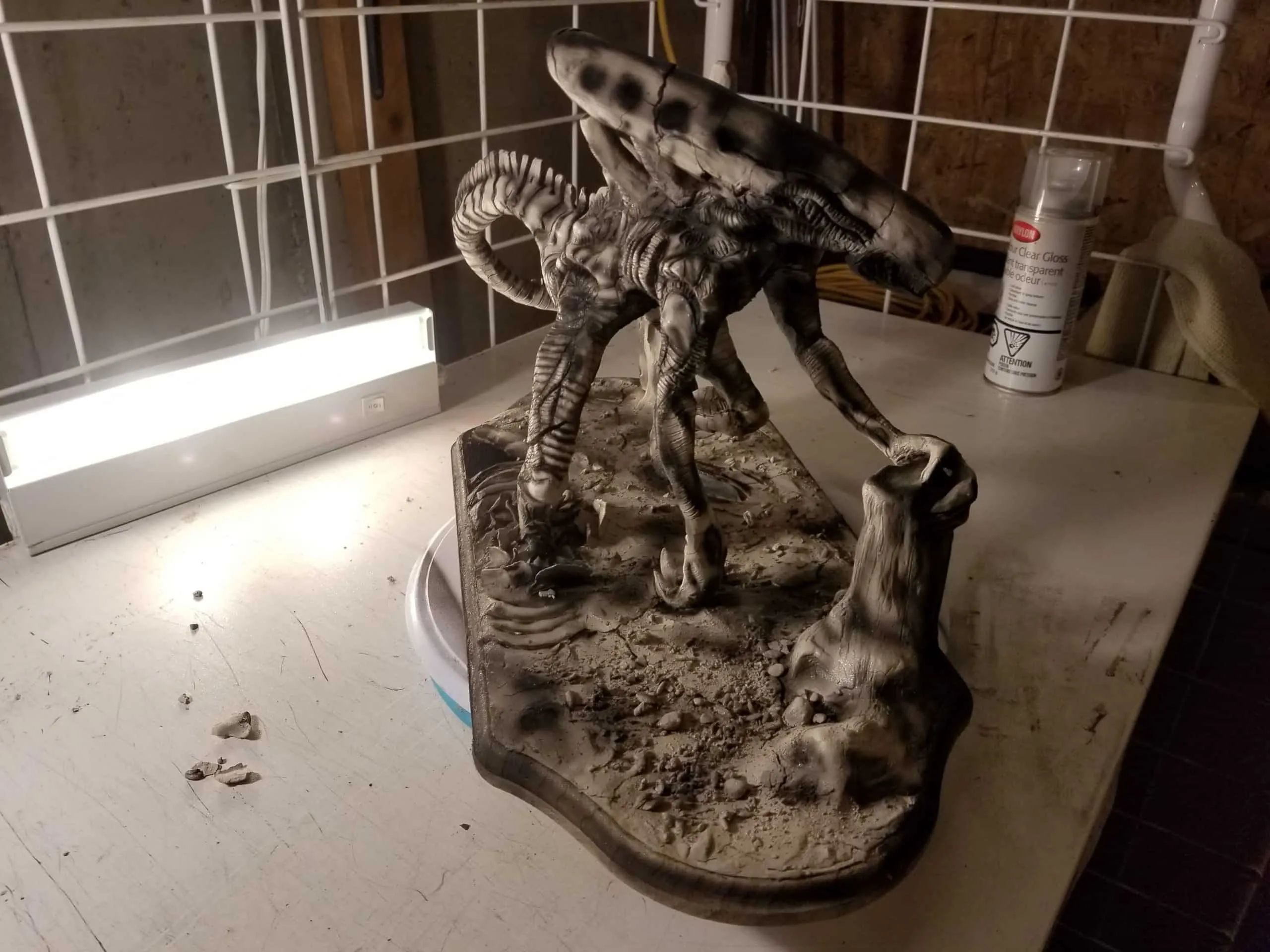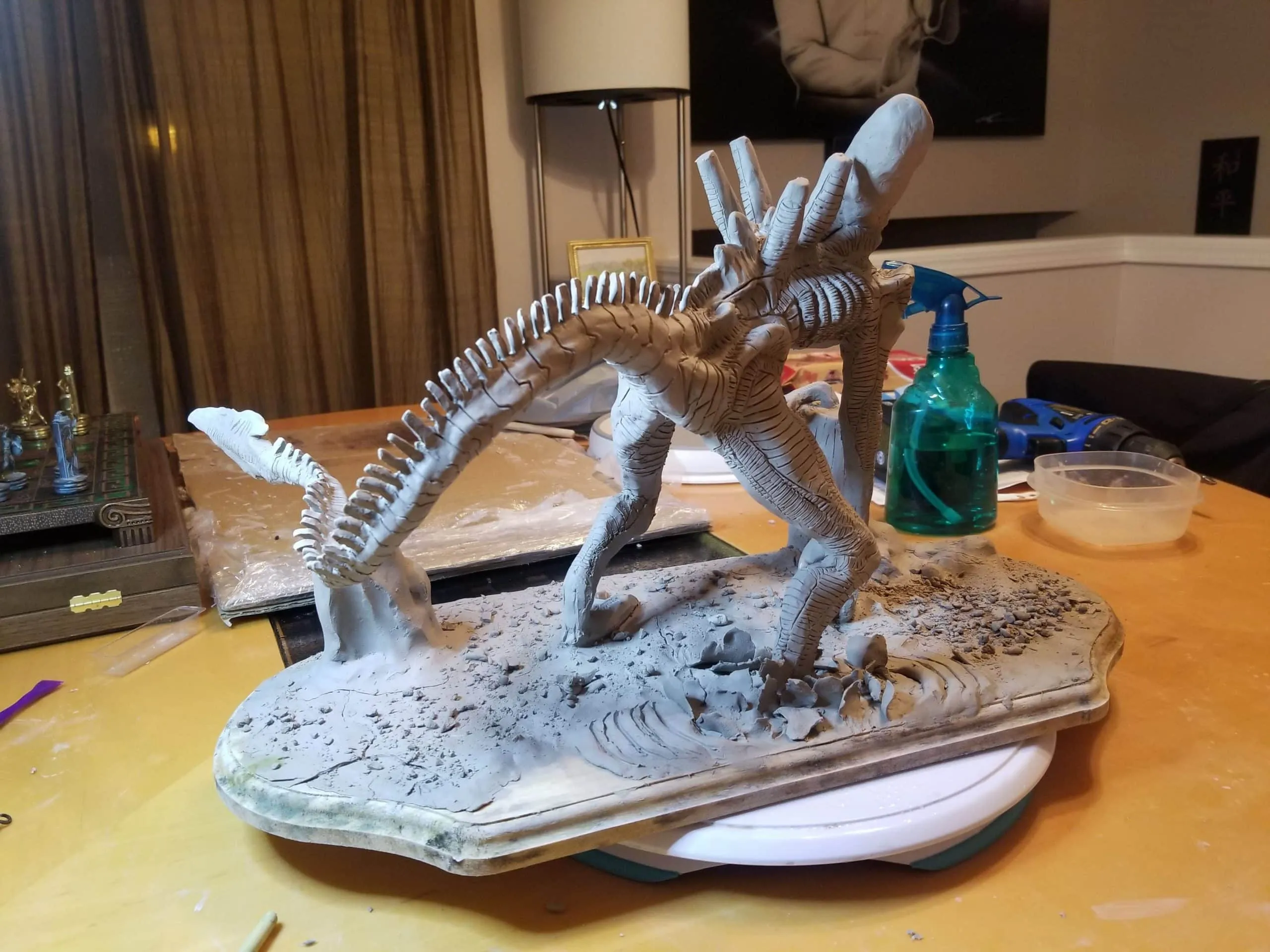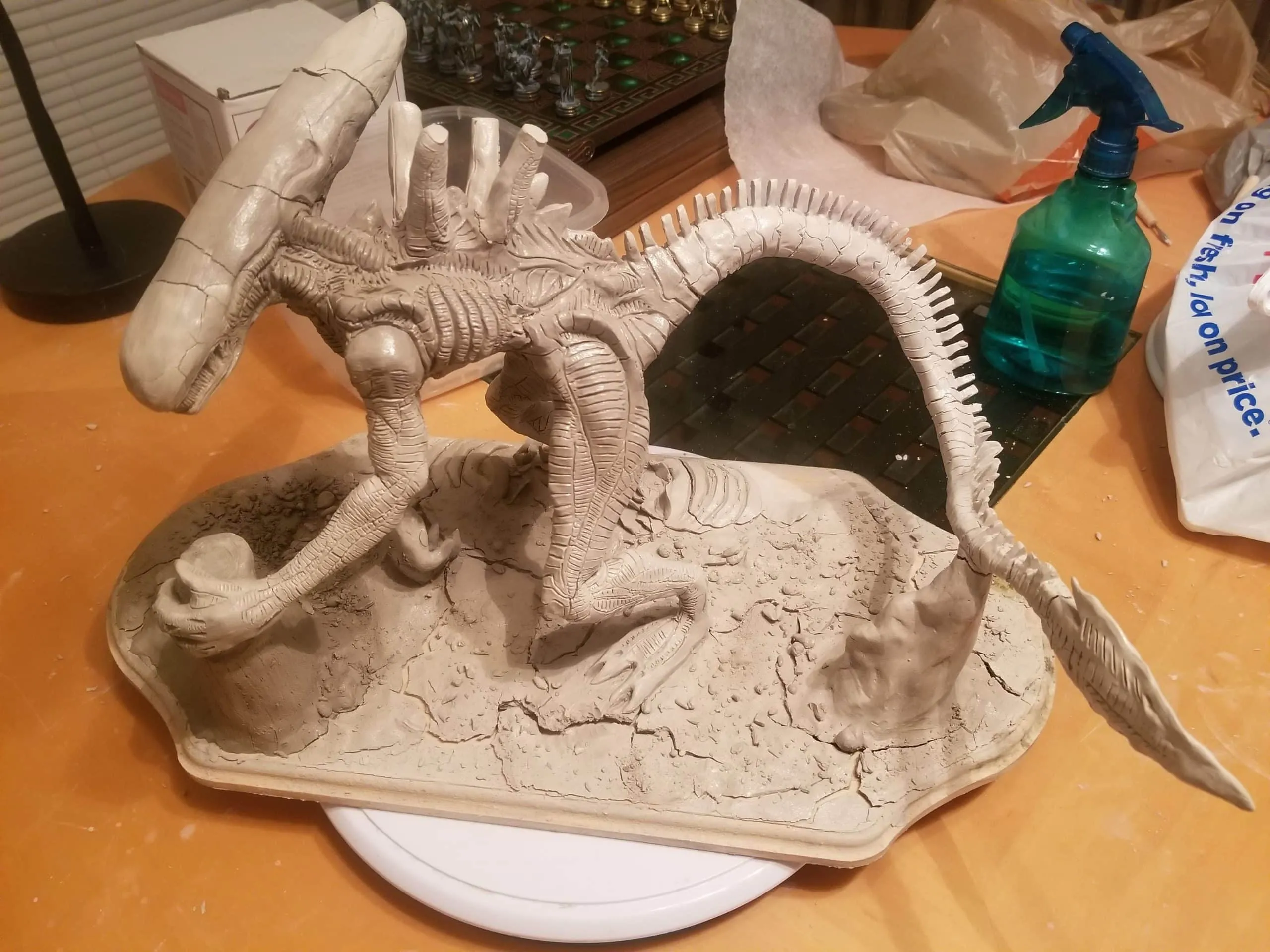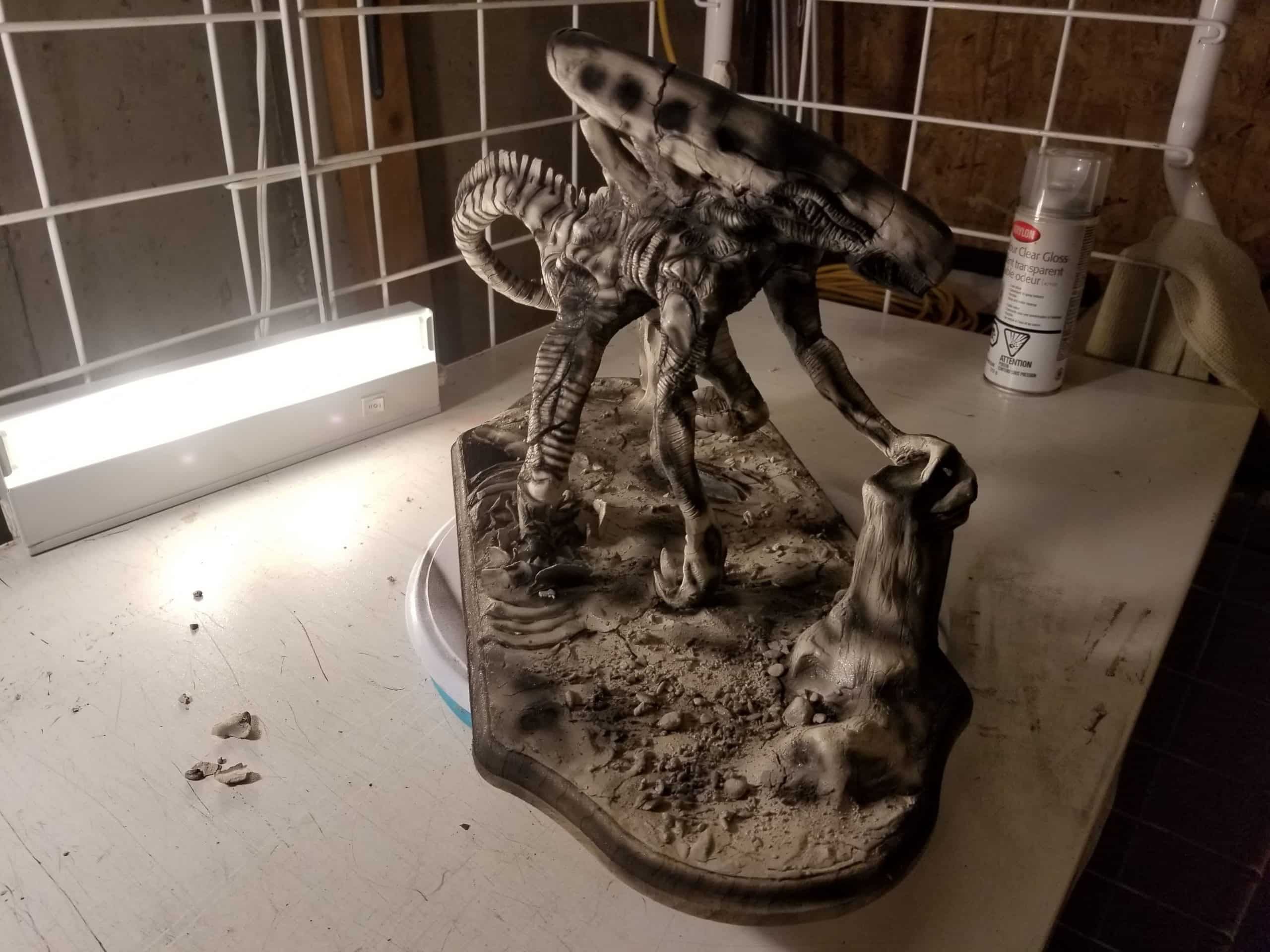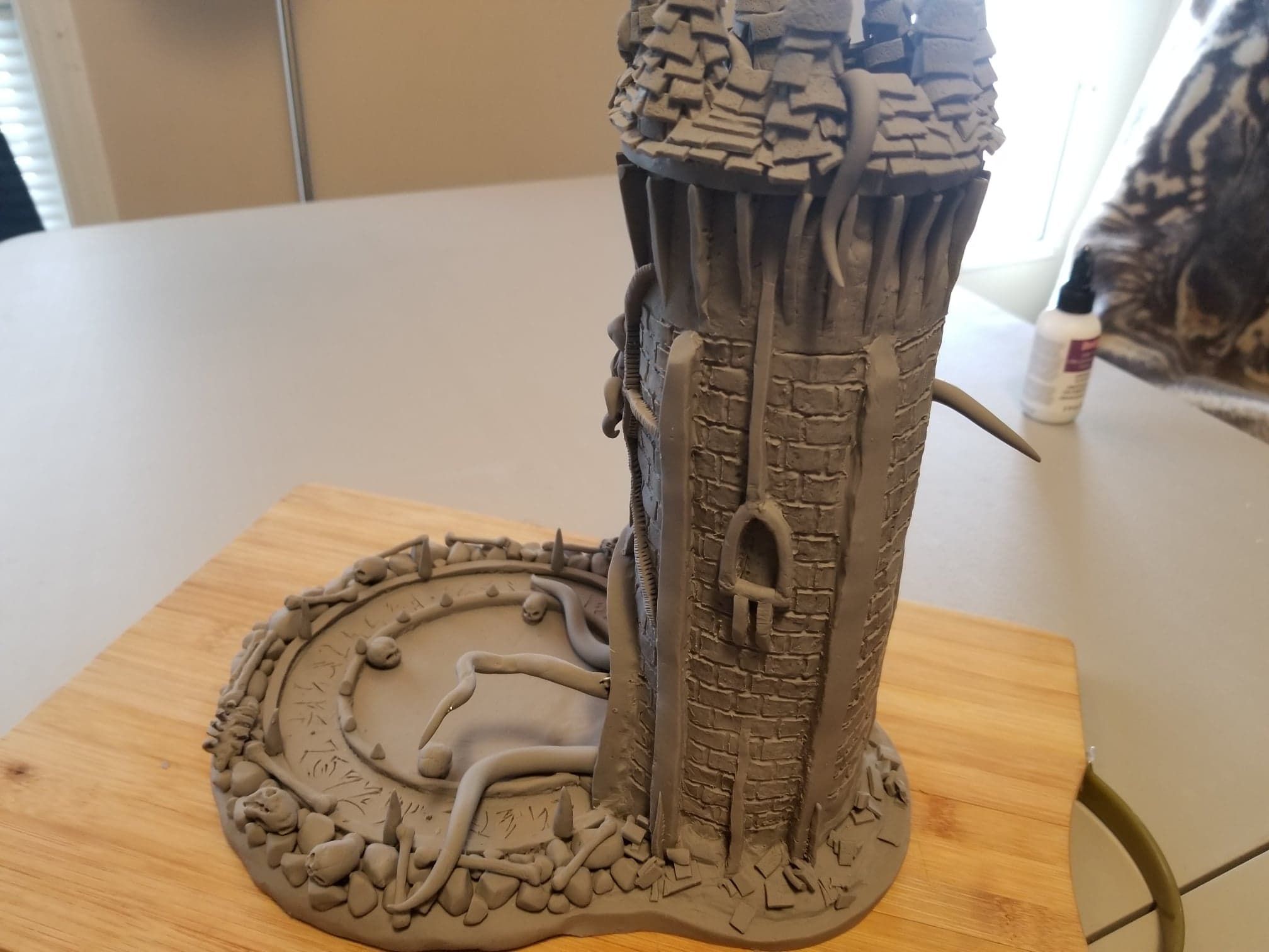 Just the same, I was determined to get something out of the experience so I sealed the sculpture up best I could, and airbrushed the base shading- before having to move, first once- then twice- before the sculpture was discovered by the cat. Needless to say, it is no longer on the to-do list, and now rests in a position of prestige in our gaming room.