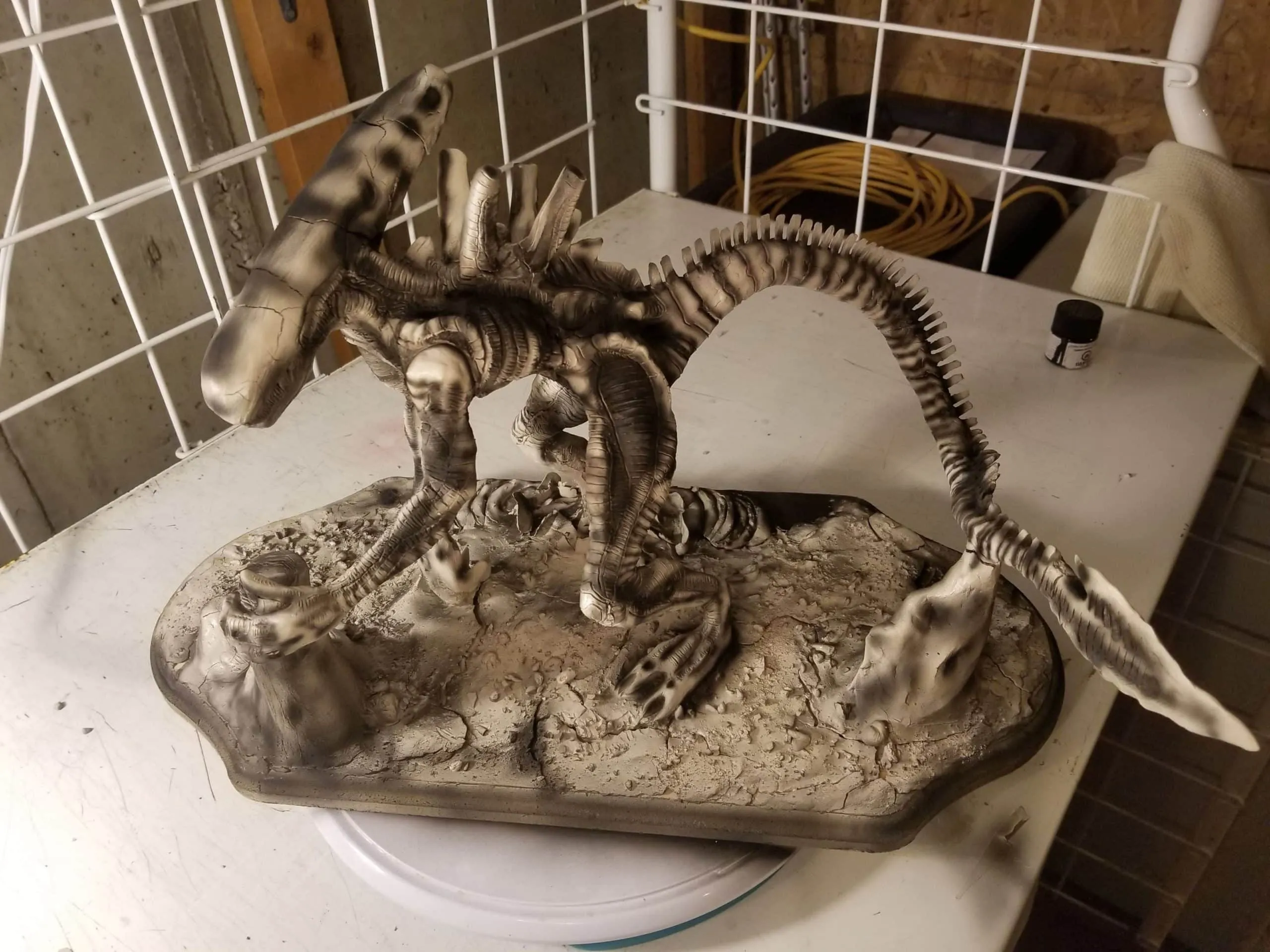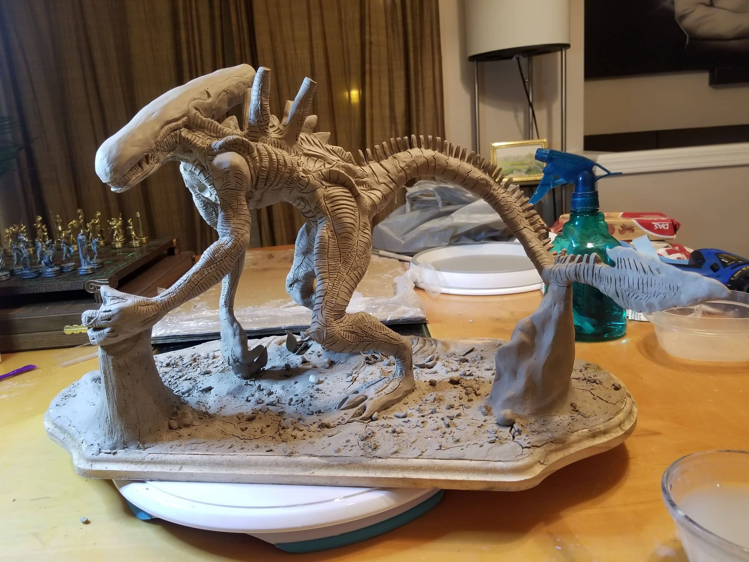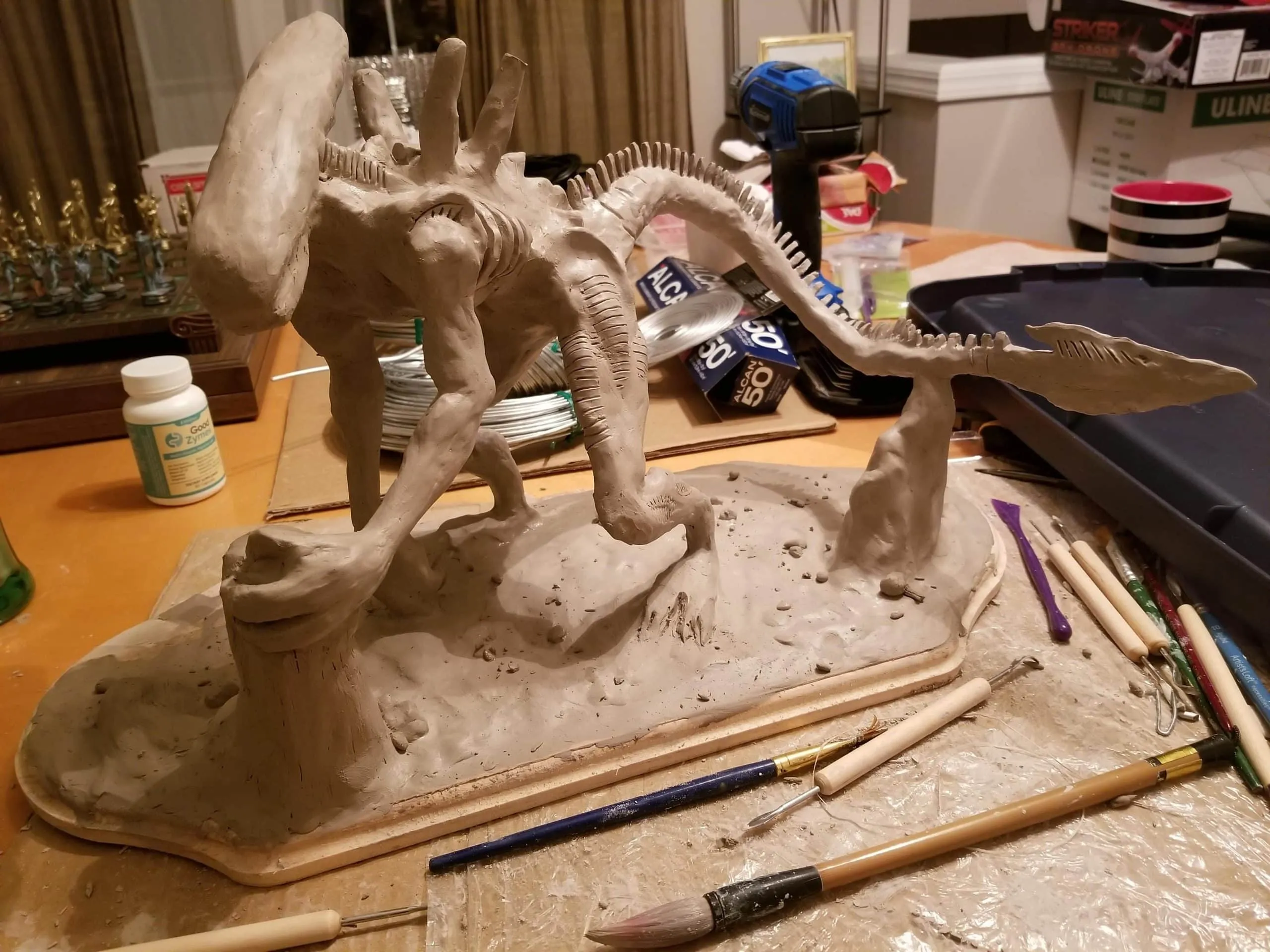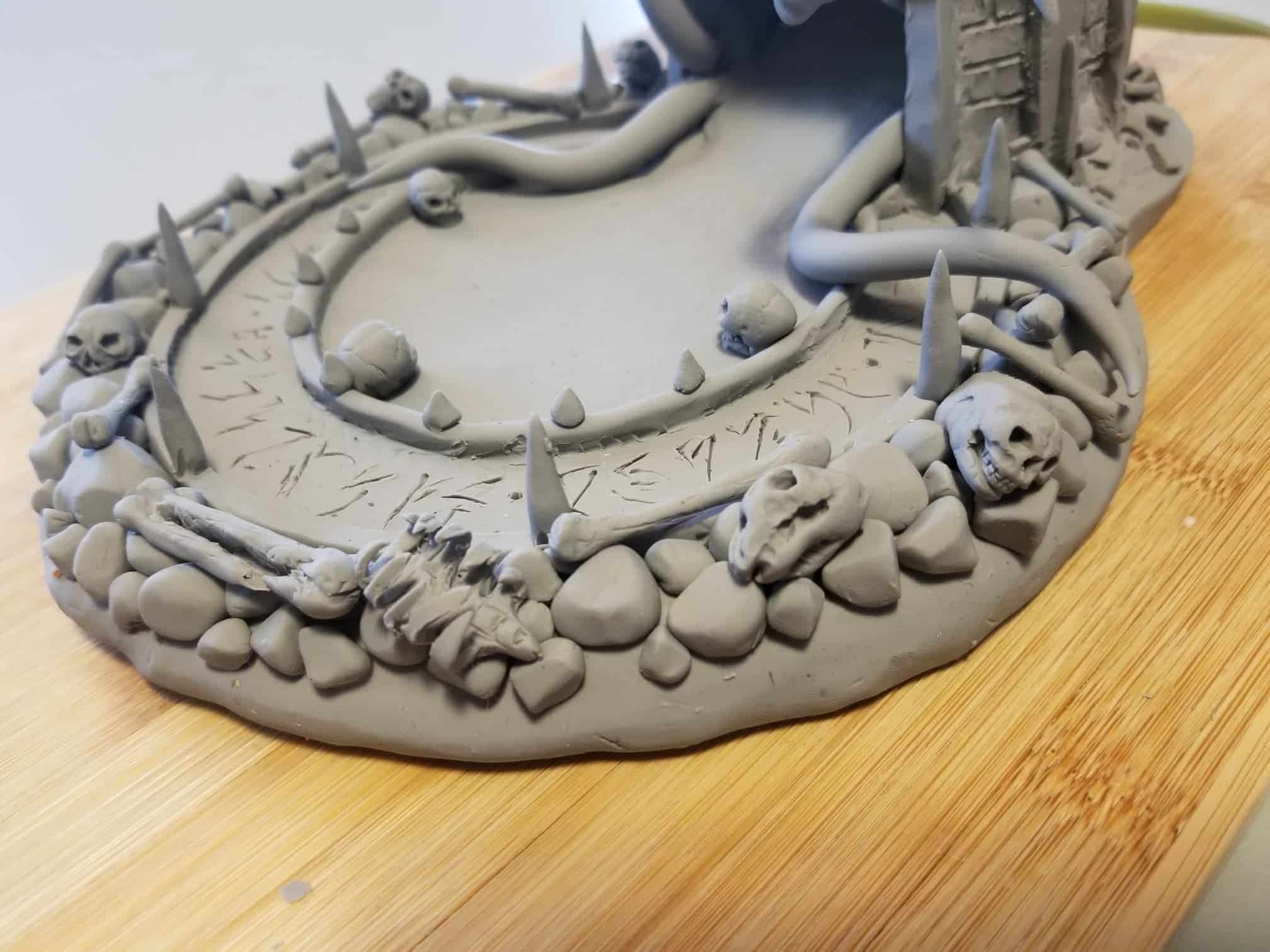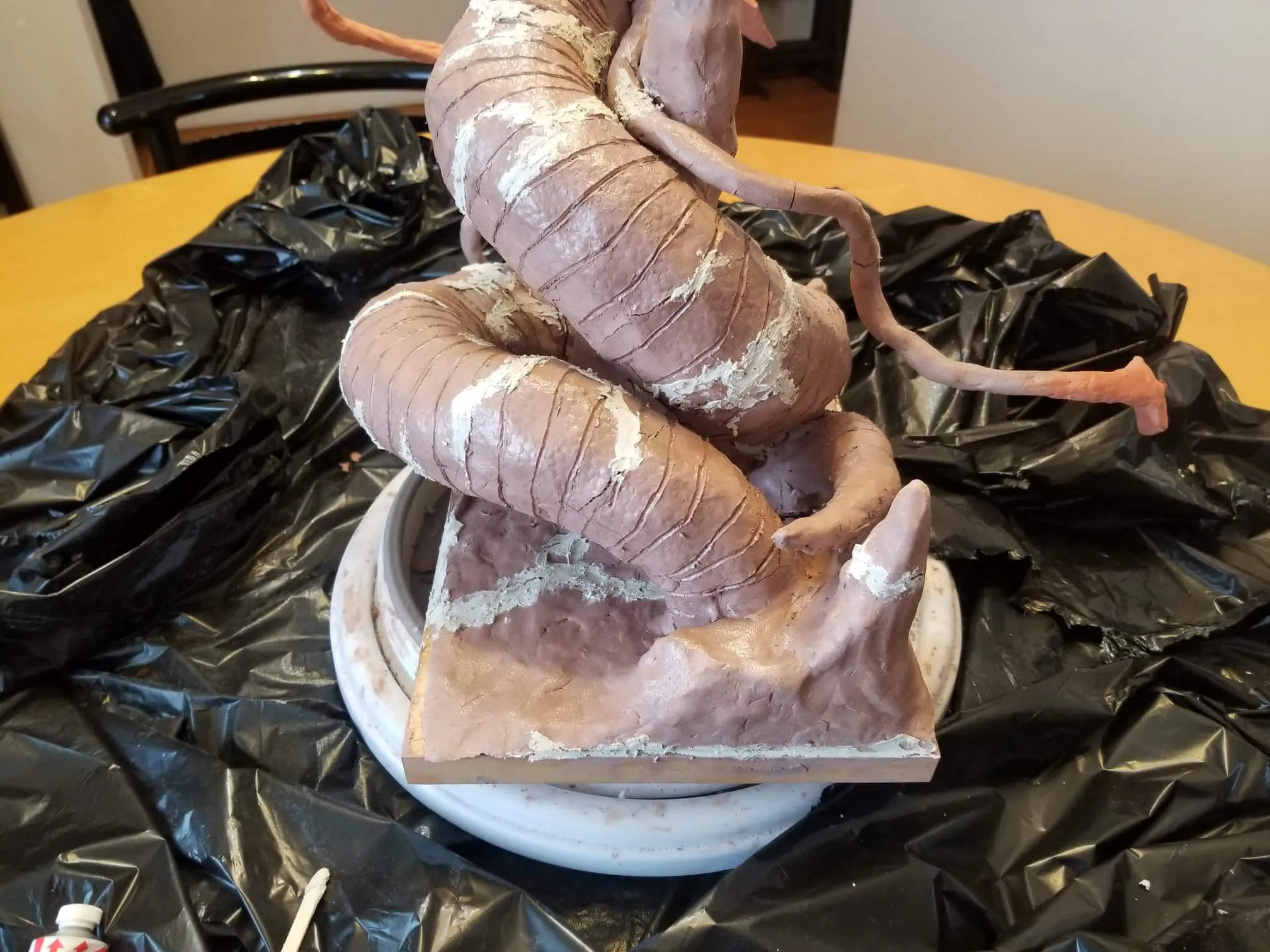 Just the same, I was determined to get something out of the experience so I sealed the sculpture up best I could, and airbrushed the base shading- before having to move, first once- then twice- before the sculpture was discovered by the cat. Needless to say, it is no longer on the to-do list, and now rests in a position of prestige in our gaming room.