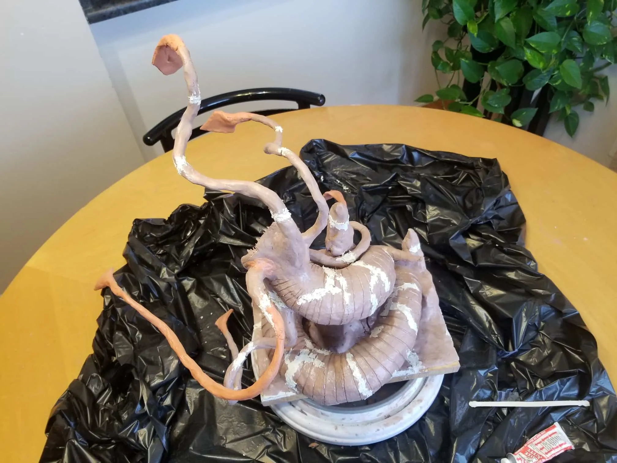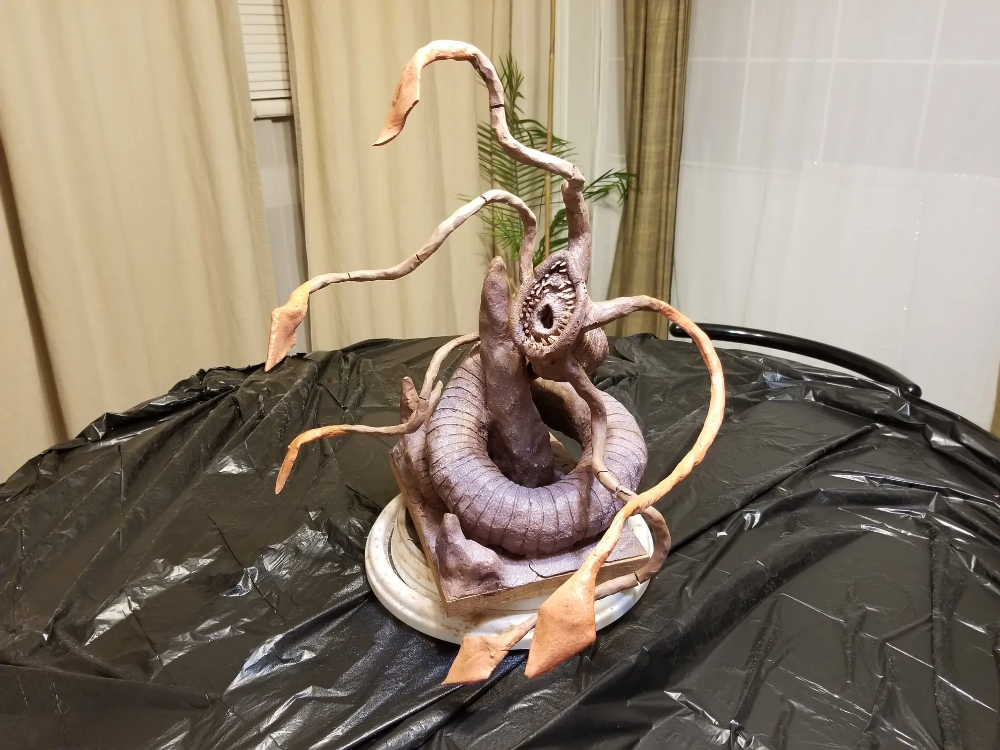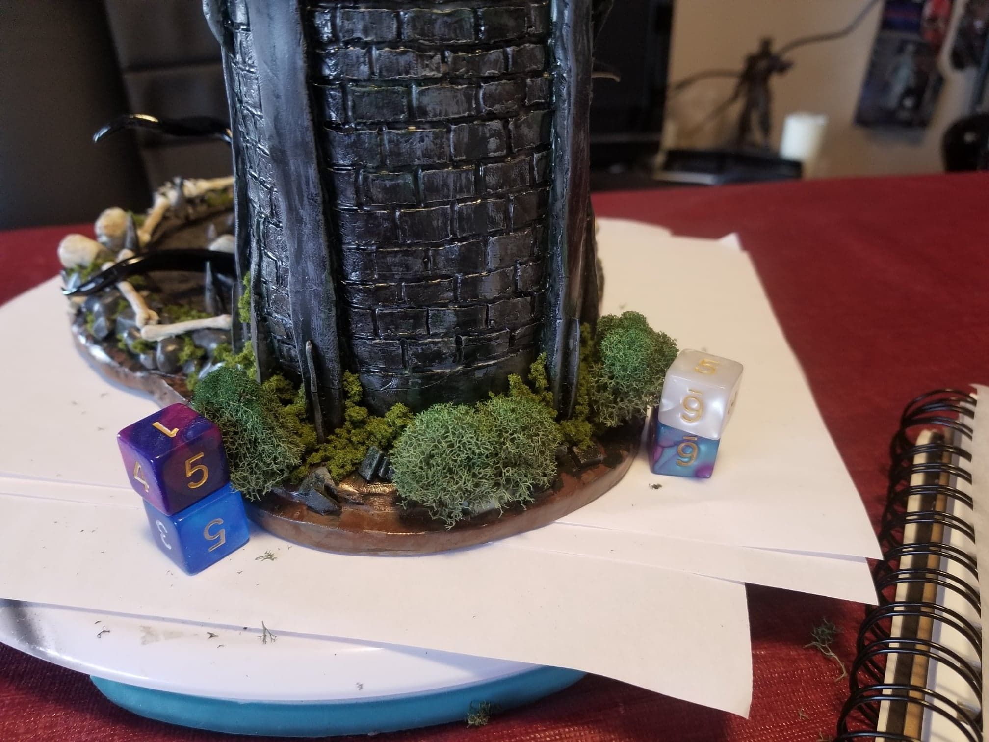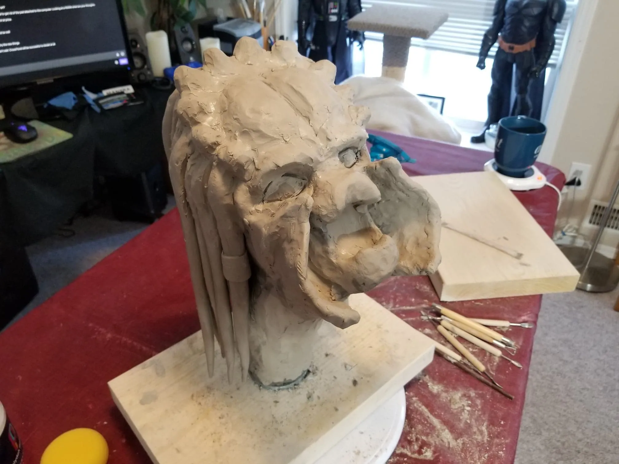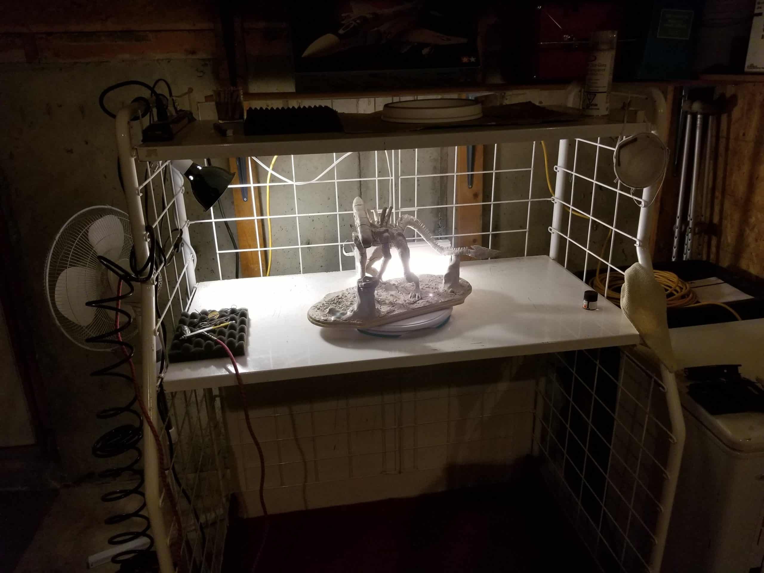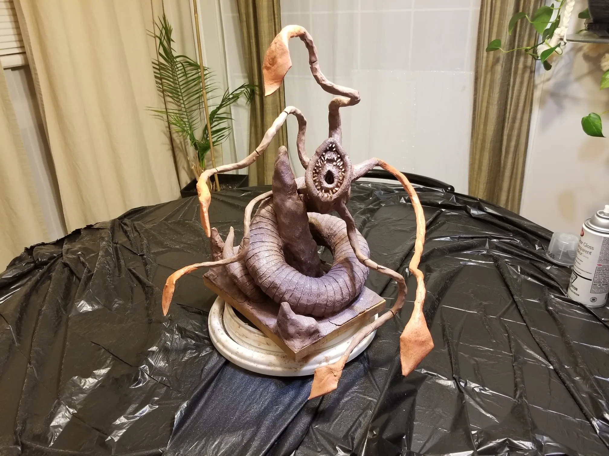 Just the same, I was determined to get something out of the experience so I sealed the sculpture up best I could, and airbrushed the base shading- before having to move, first once- then twice- before the sculpture was discovered by the cat. Needless to say, it is no longer on the to-do list, and now rests in a position of prestige in our gaming room.