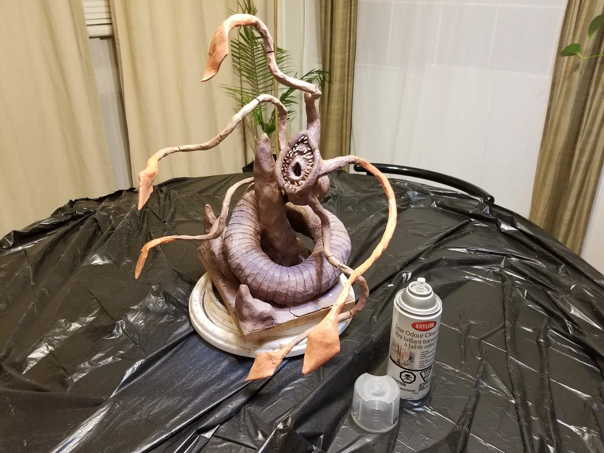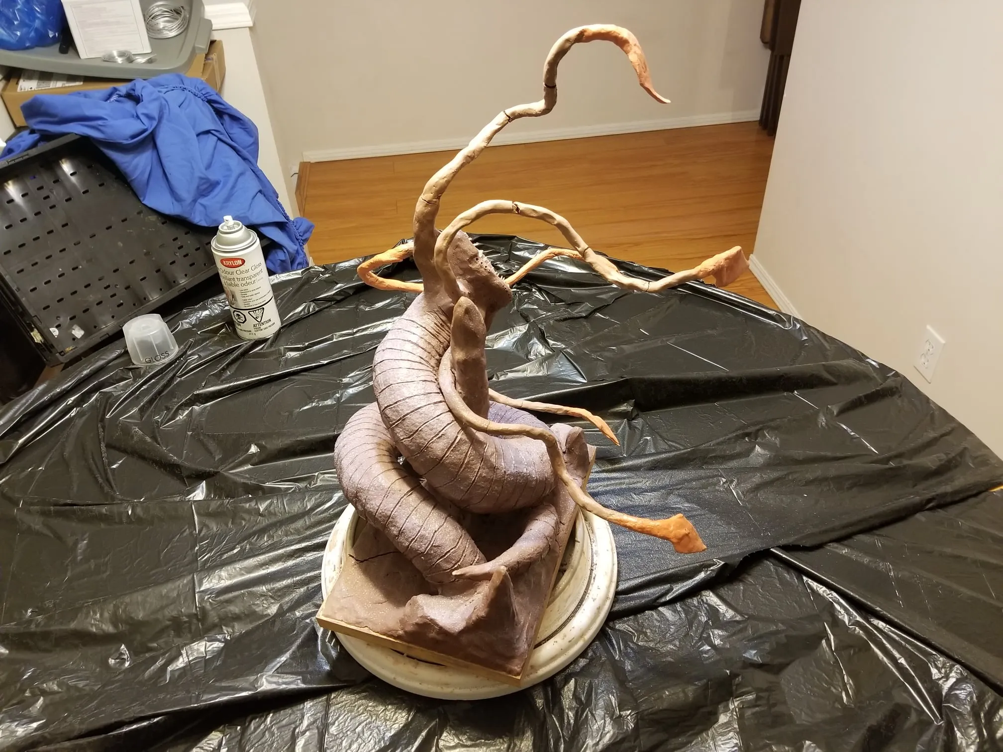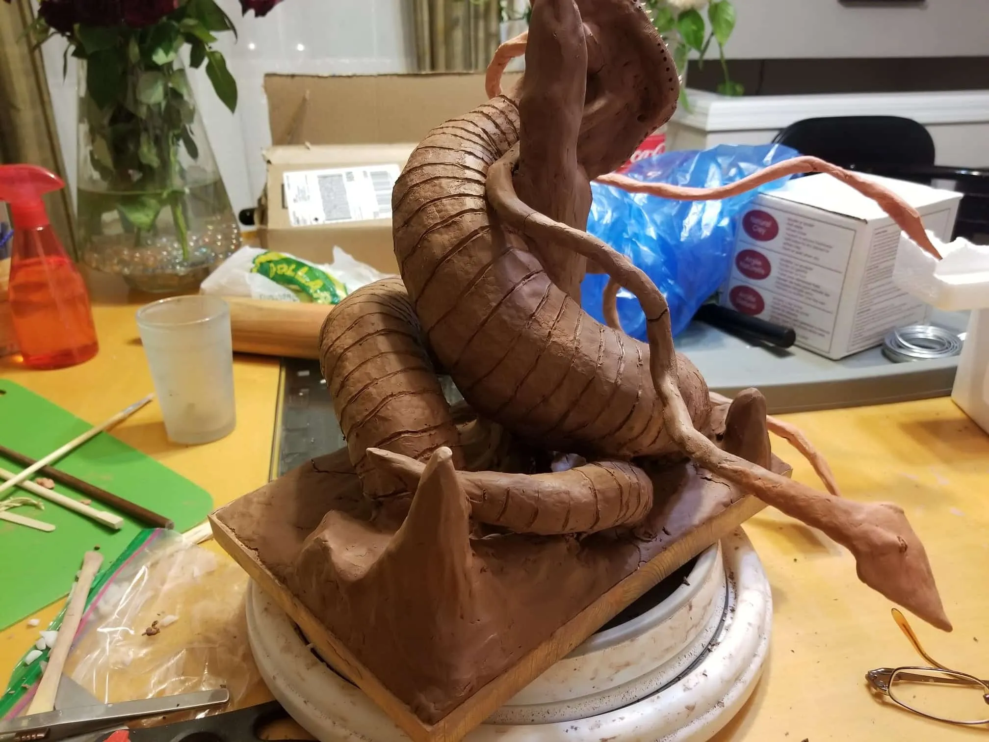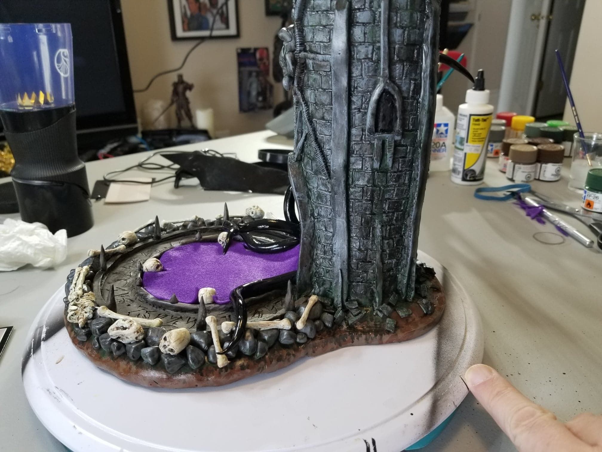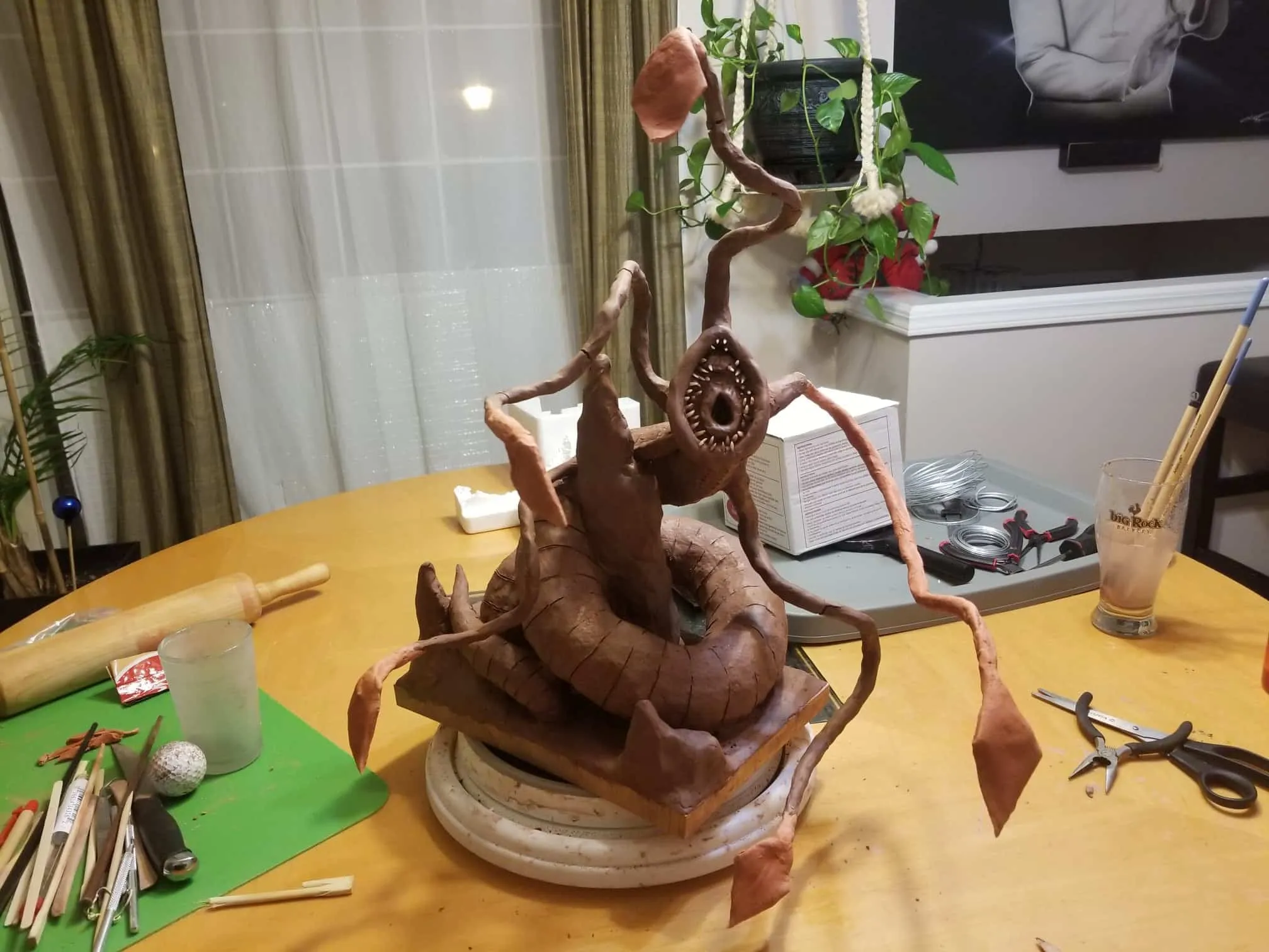 Just the same, I was determined to get something out of the experience so I sealed the sculpture up best I could, and airbrushed the base shading- before having to move, first once- then twice- before the sculpture was discovered by the cat. Needless to say, it is no longer on the to-do list, and now rests in a position of prestige in our gaming room.