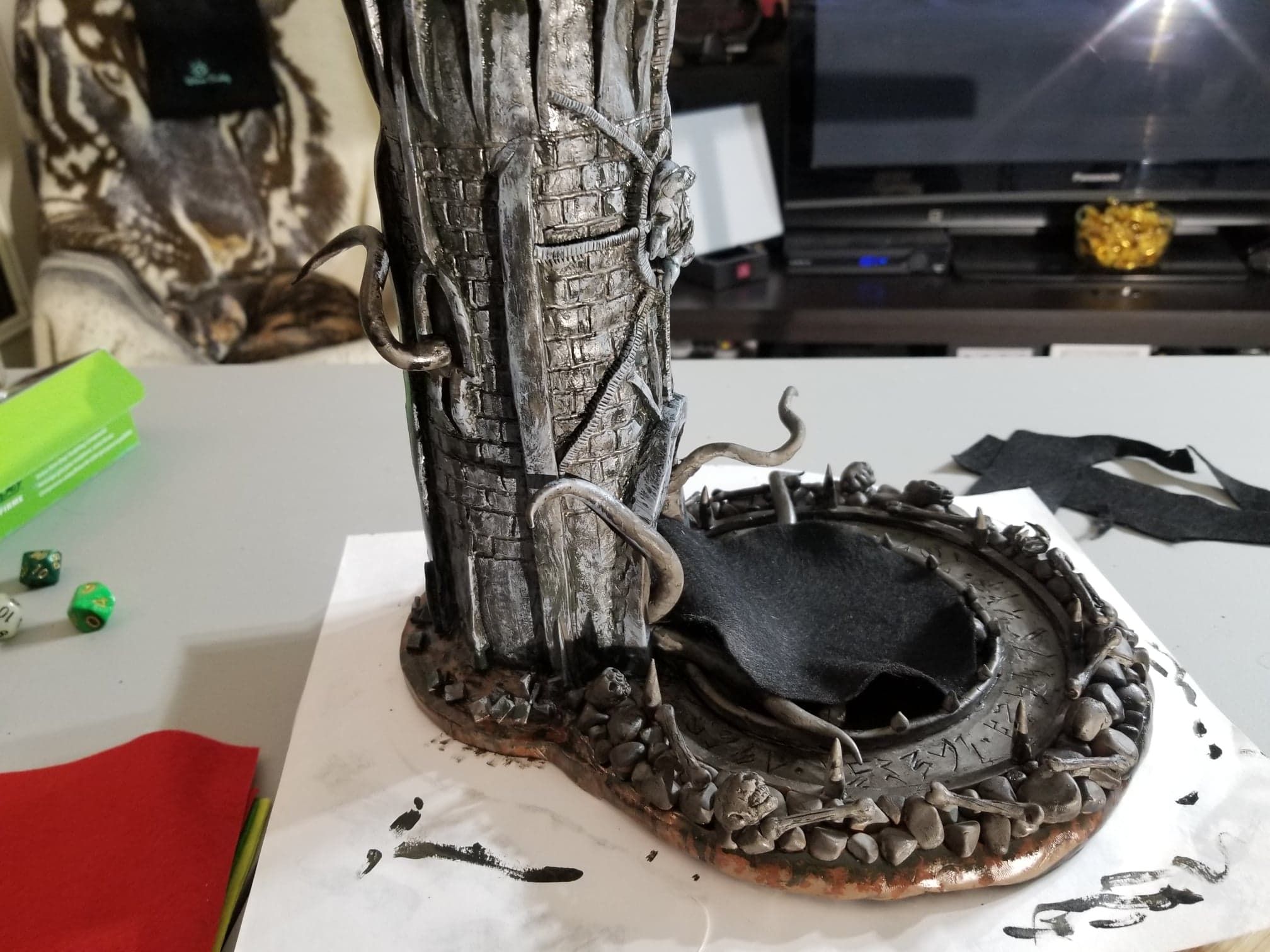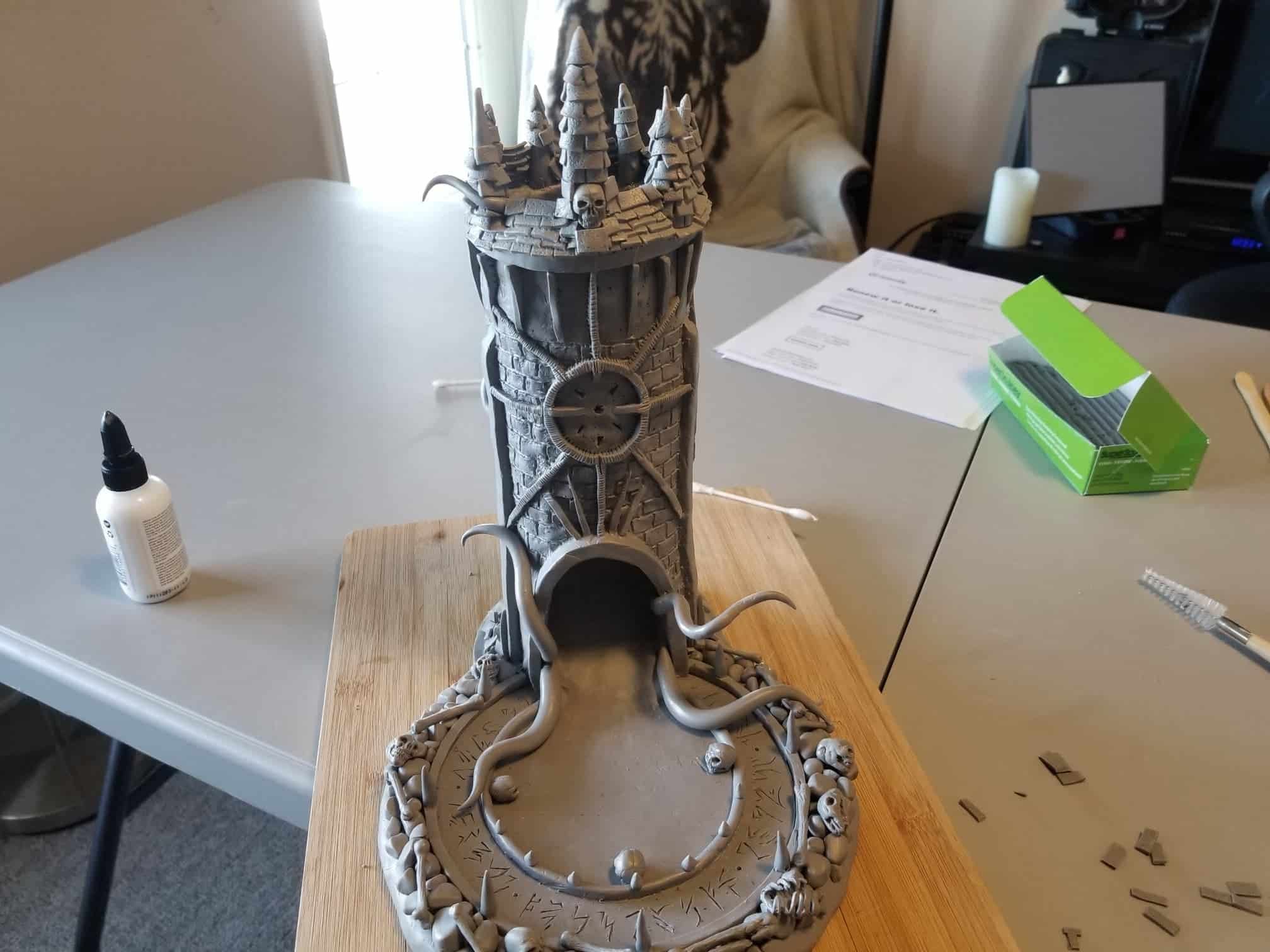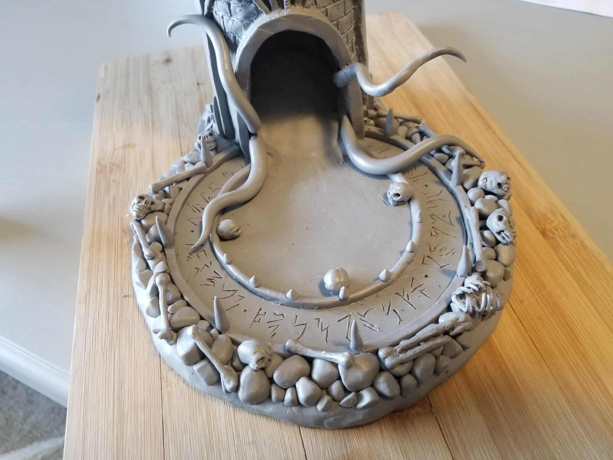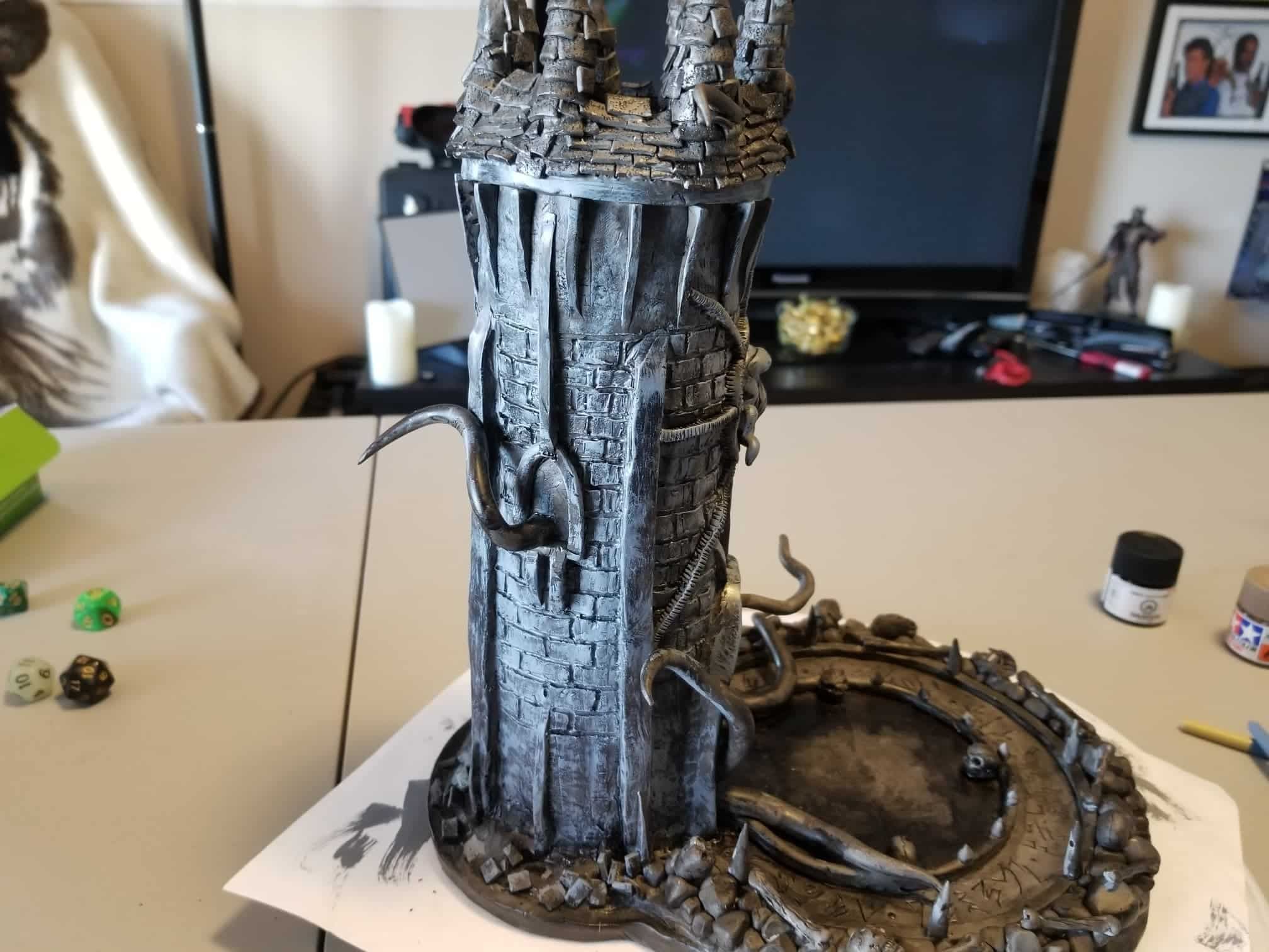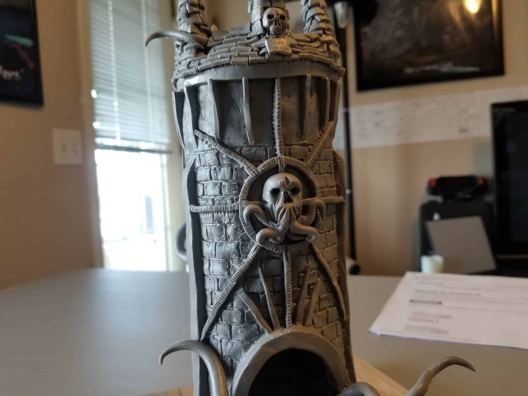Once again working from insider my head (instead of a proper rough sketch to ease my future frustration) I dove right in with a batch of sculpting tools, a roll of chicken-wire, and a dream (lol). Of course I’m a big fan of the H.P. Lovecraft ‘Cthulhu’ mythos, horror in general, and wanted to incorporate a batch of my interests in one fell swoop. This dice tower is the result.