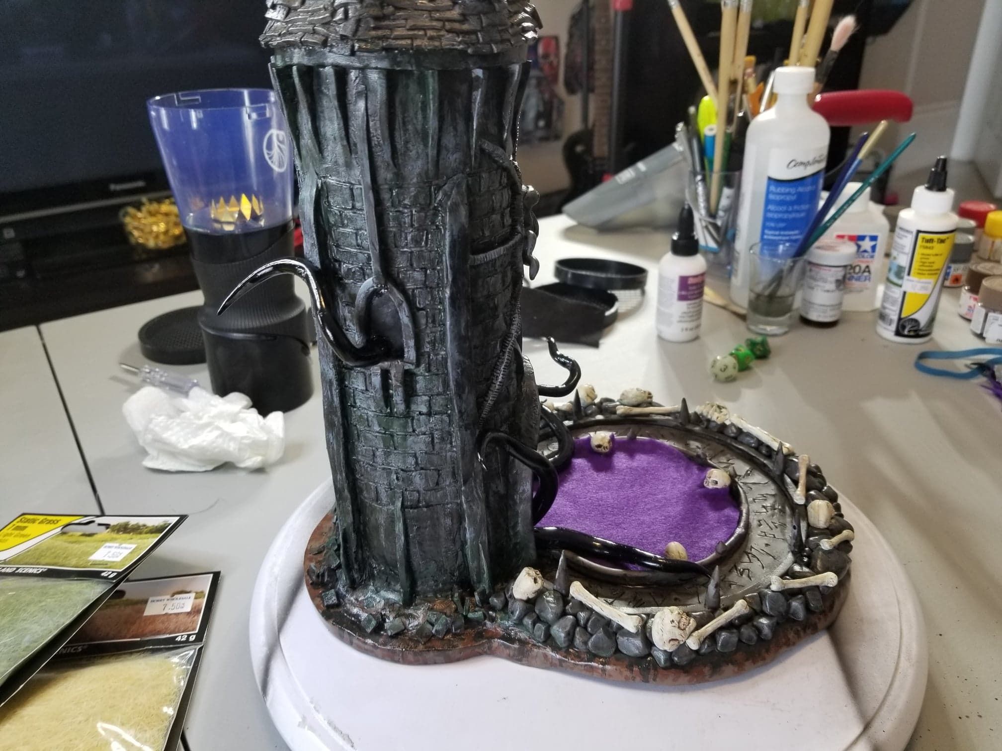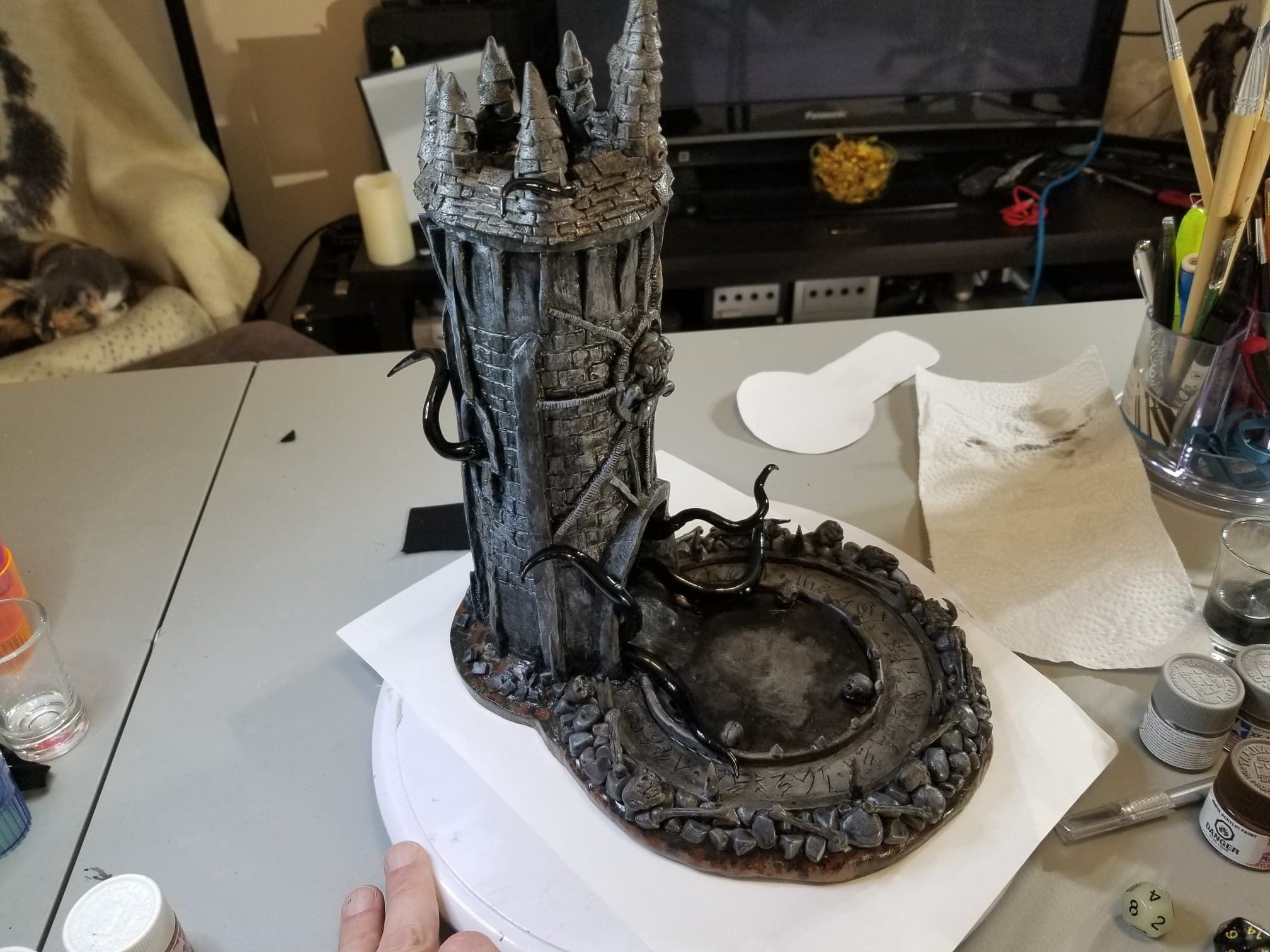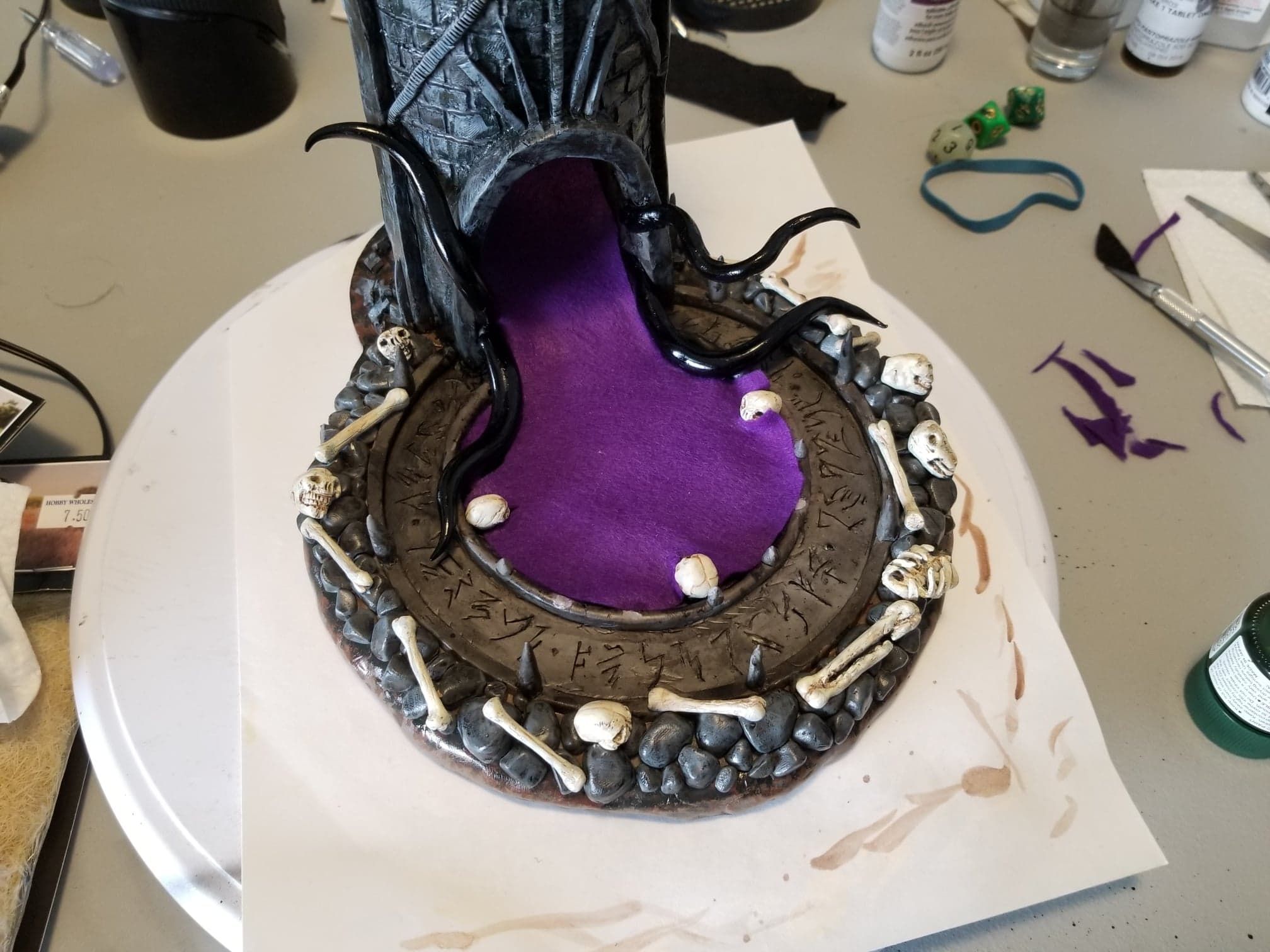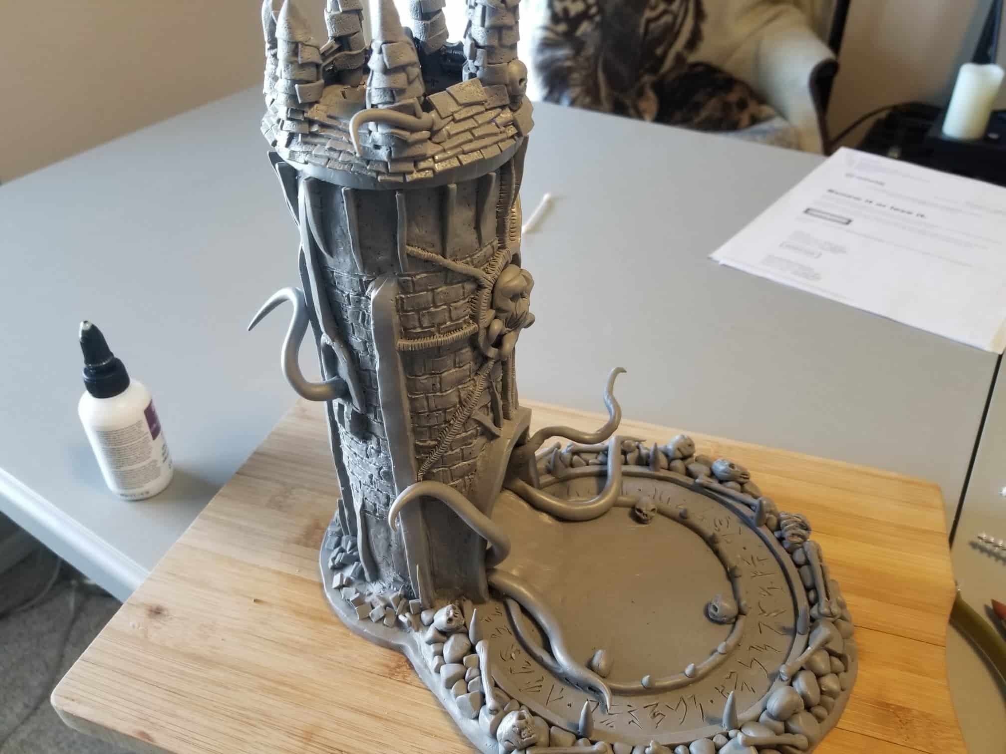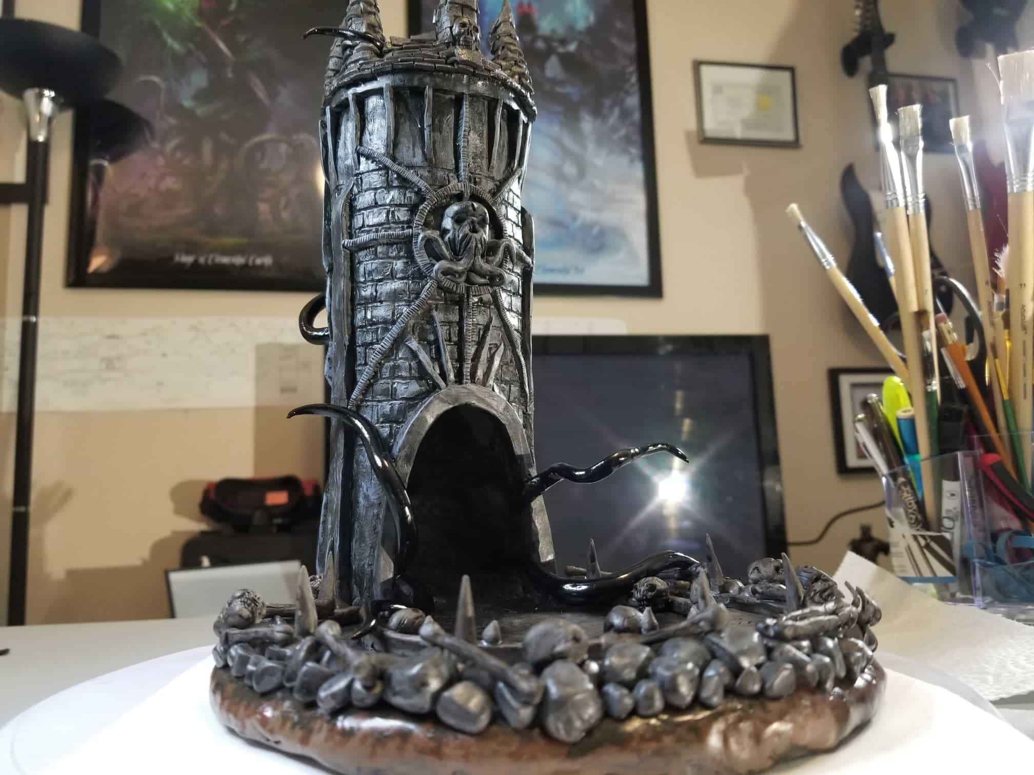 Once again working from insider my head (instead of a proper rough sketch to ease my future frustration) I dove right in with a batch of sculpting tools, a roll of chicken-wire, and a dream (lol). Of course I’m a big fan of the H.P. Lovecraft ‘Cthulhu’ mythos, horror in general, and wanted to incorporate a batch of my interests in one fell swoop. This dice tower is the result.