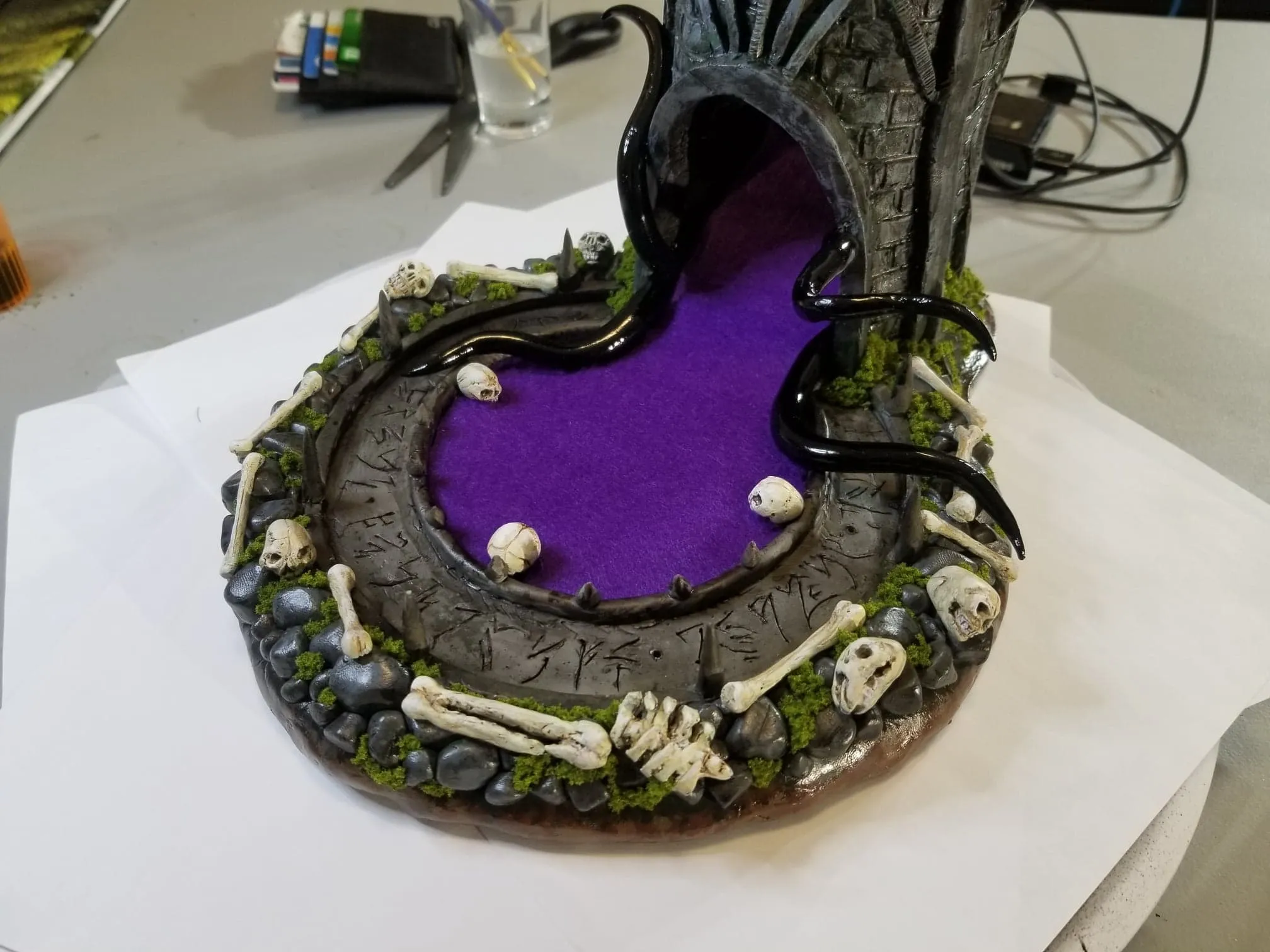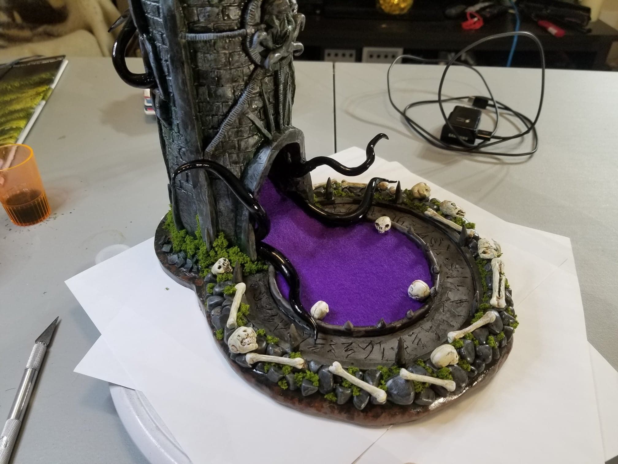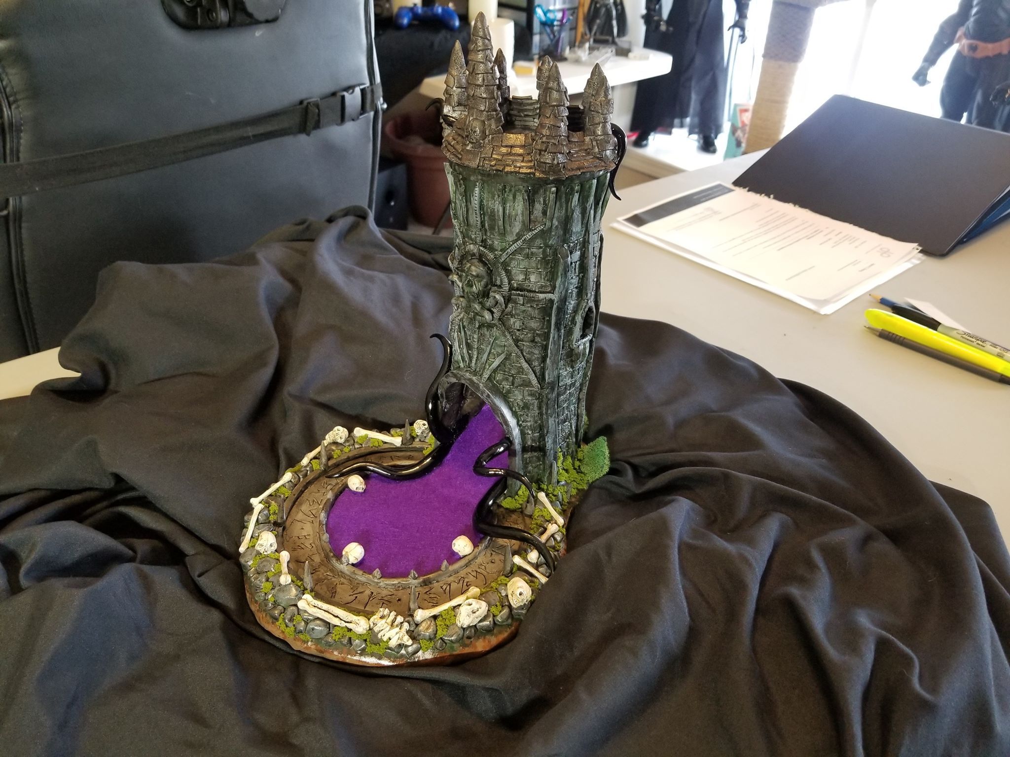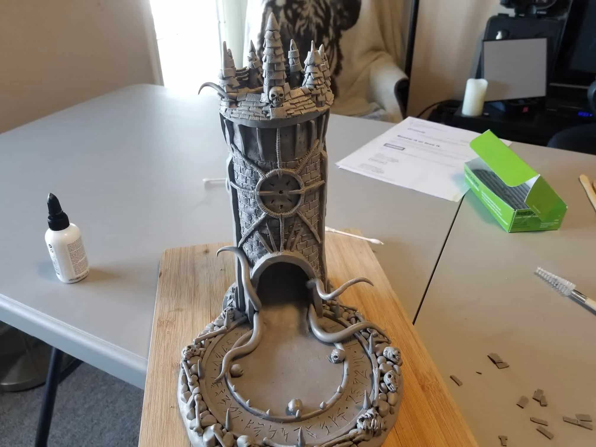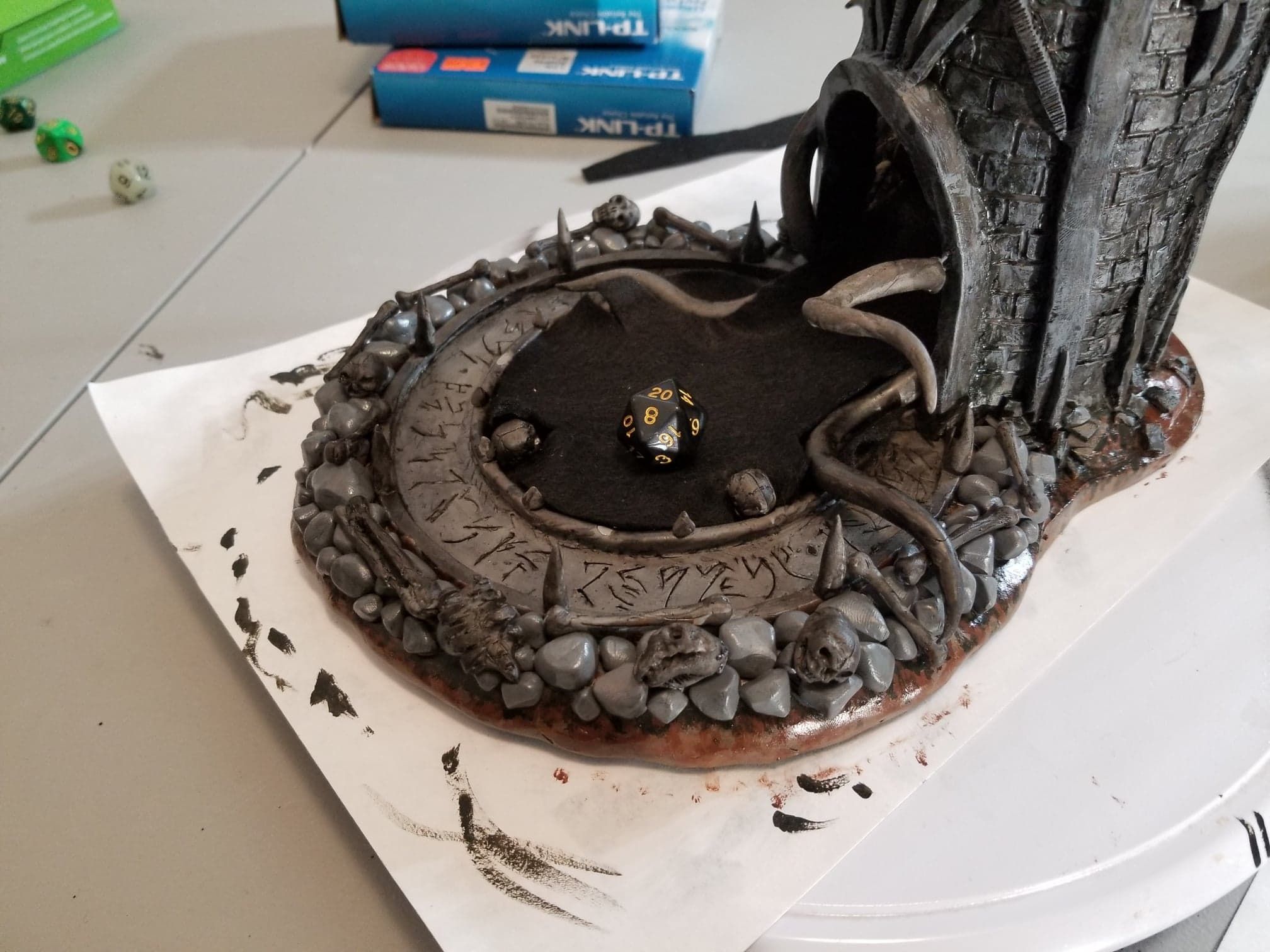 Once again working from insider my head (instead of a proper rough sketch to ease my future frustration) I dove right in with a batch of sculpting tools, a roll of chicken-wire, and a dream (lol). Of course I’m a big fan of the H.P. Lovecraft ‘Cthulhu’ mythos, horror in general, and wanted to incorporate a batch of my interests in one fell swoop. This dice tower is the result.