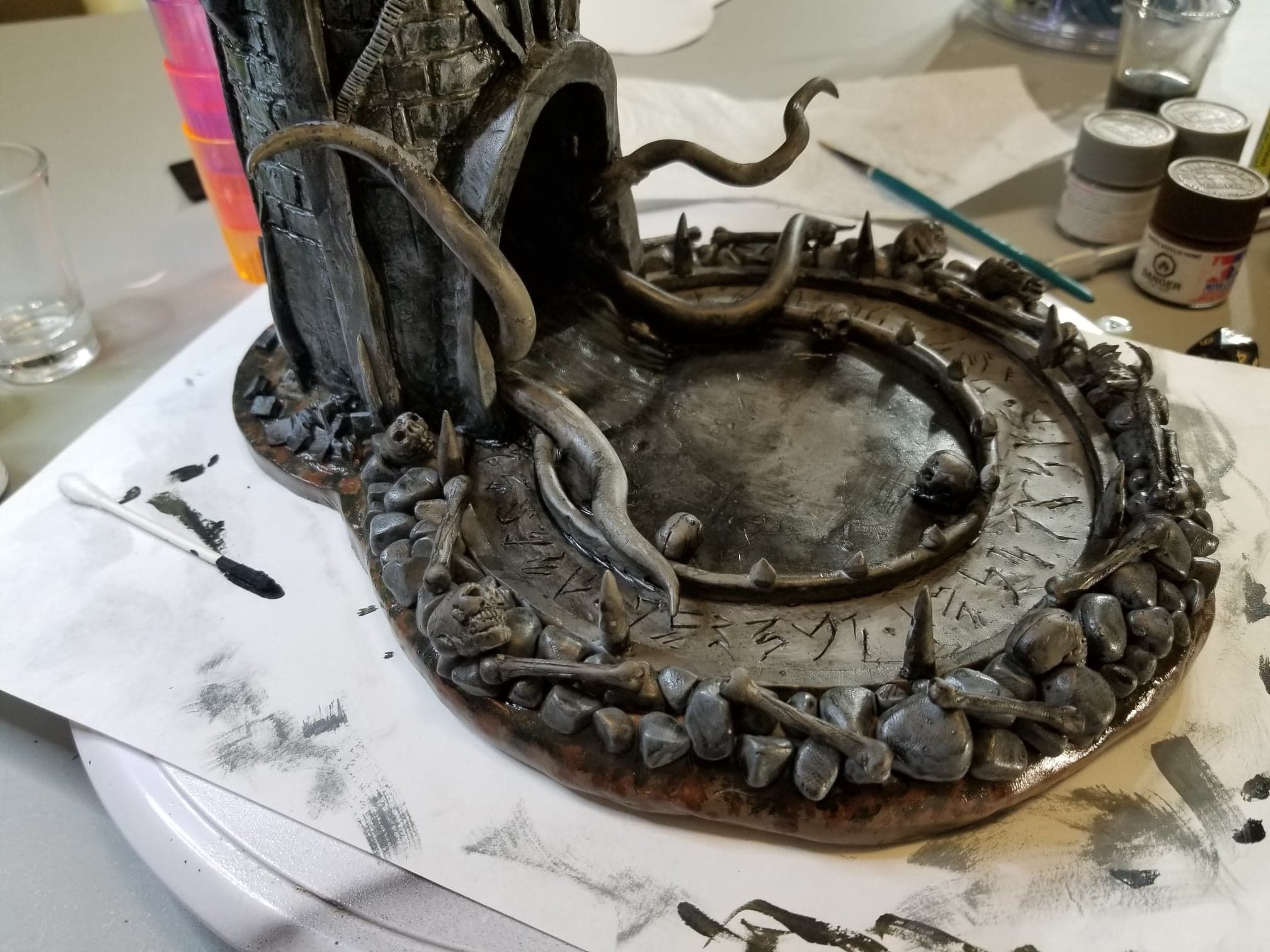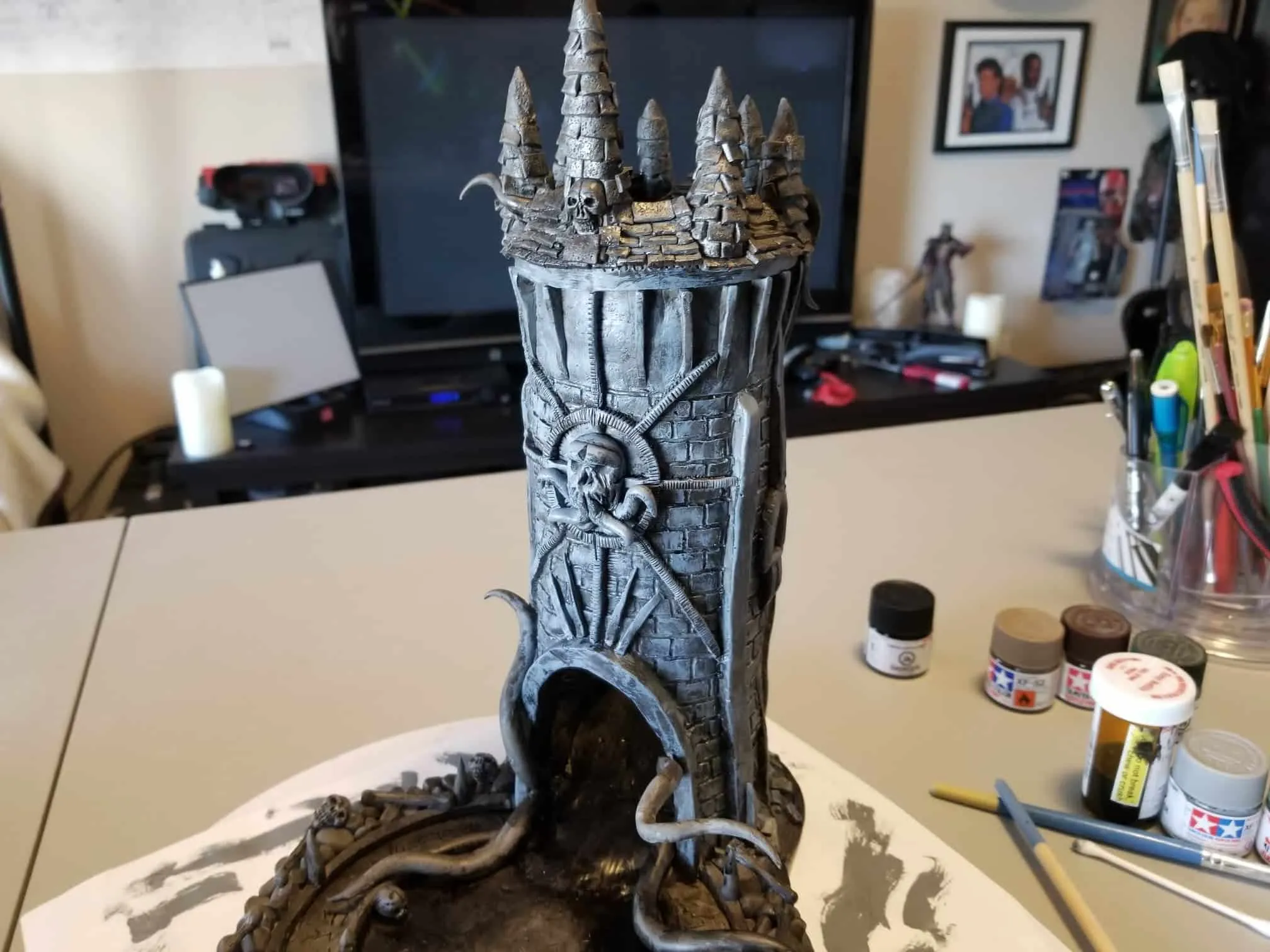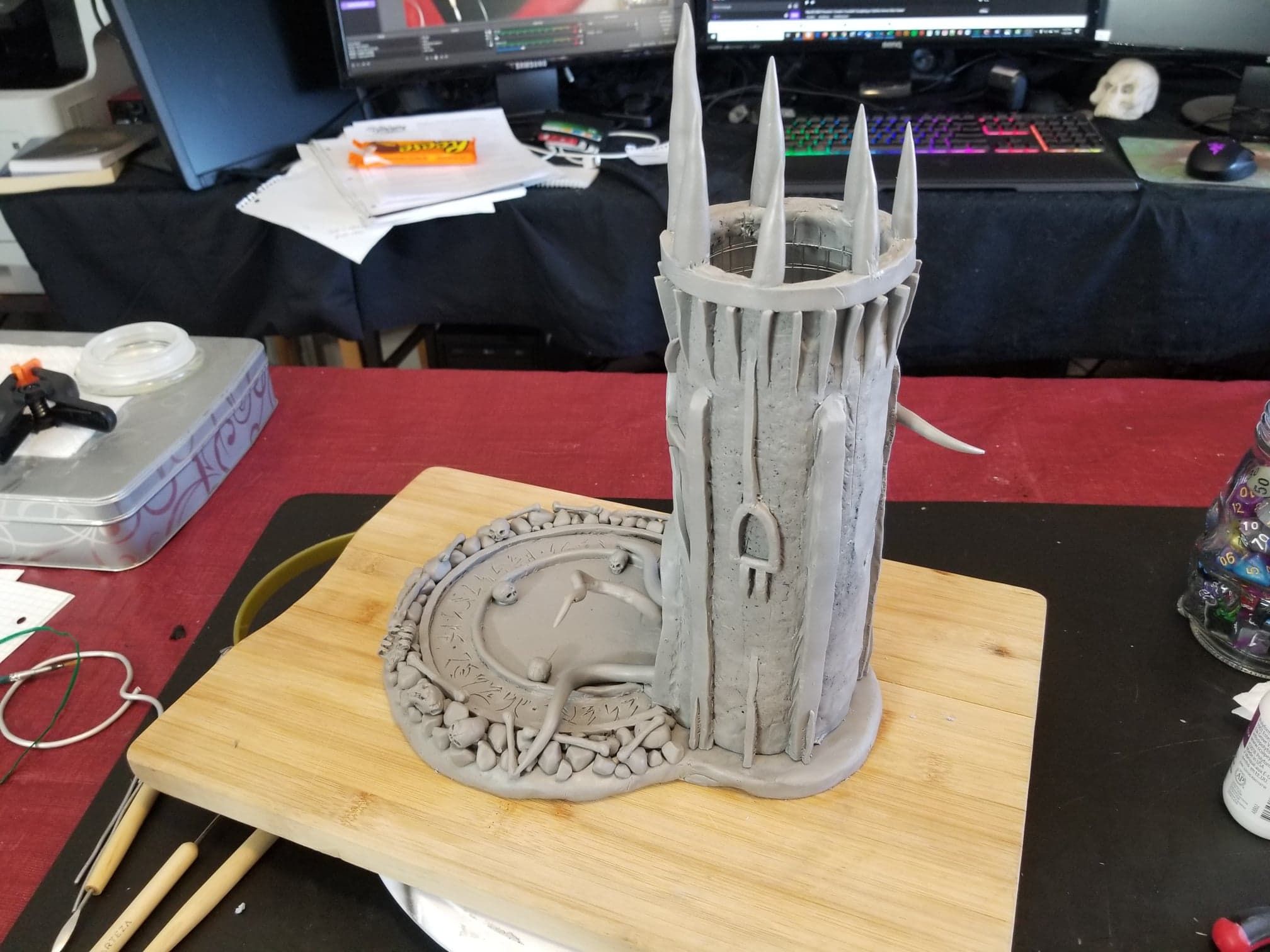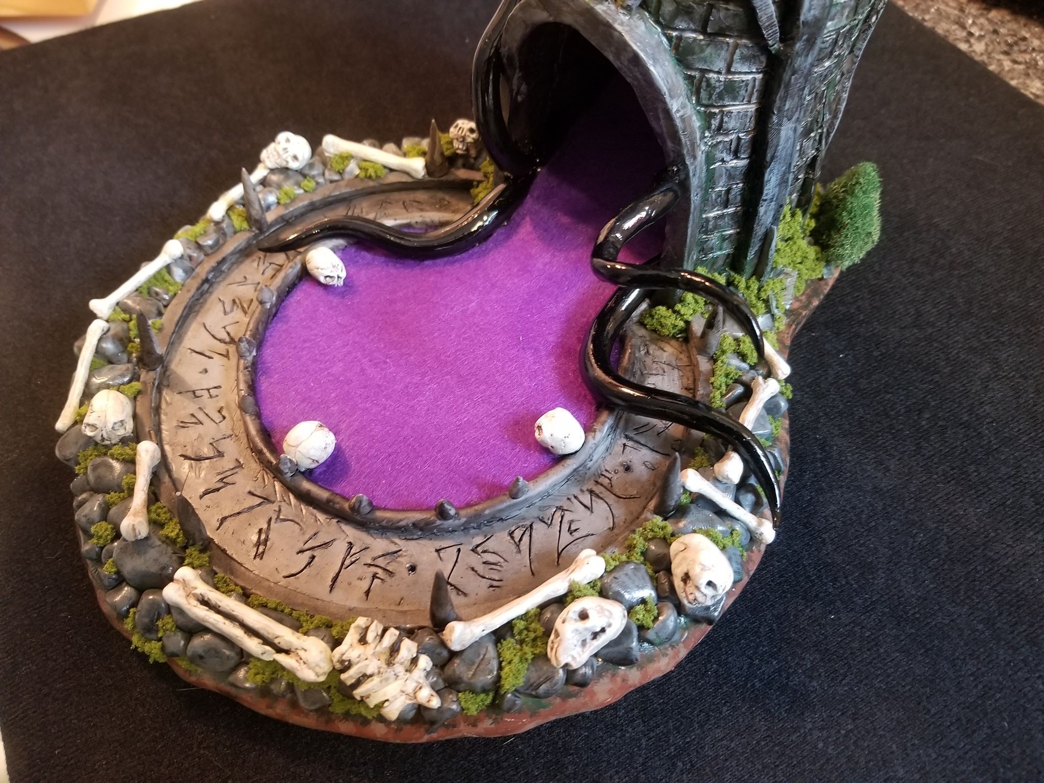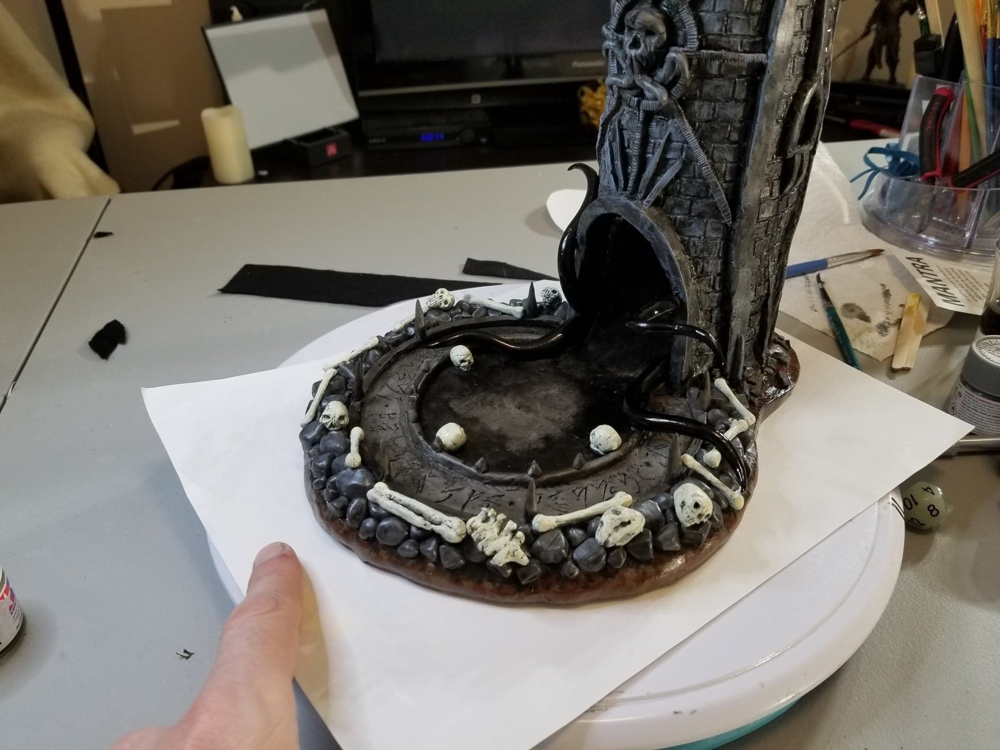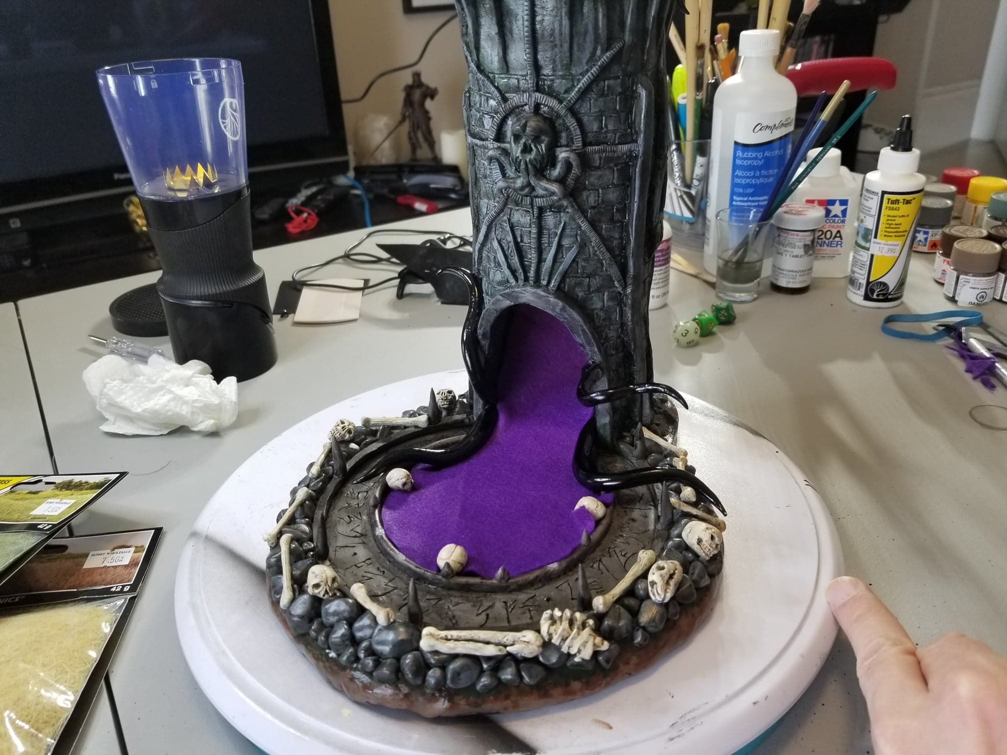 Once again working from insider my head (instead of a proper rough sketch to ease my future frustration) I dove right in with a batch of sculpting tools, a roll of chicken-wire, and a dream (lol). Of course I’m a big fan of the H.P. Lovecraft ‘Cthulhu’ mythos, horror in general, and wanted to incorporate a batch of my interests in one fell swoop. This dice tower is the result.