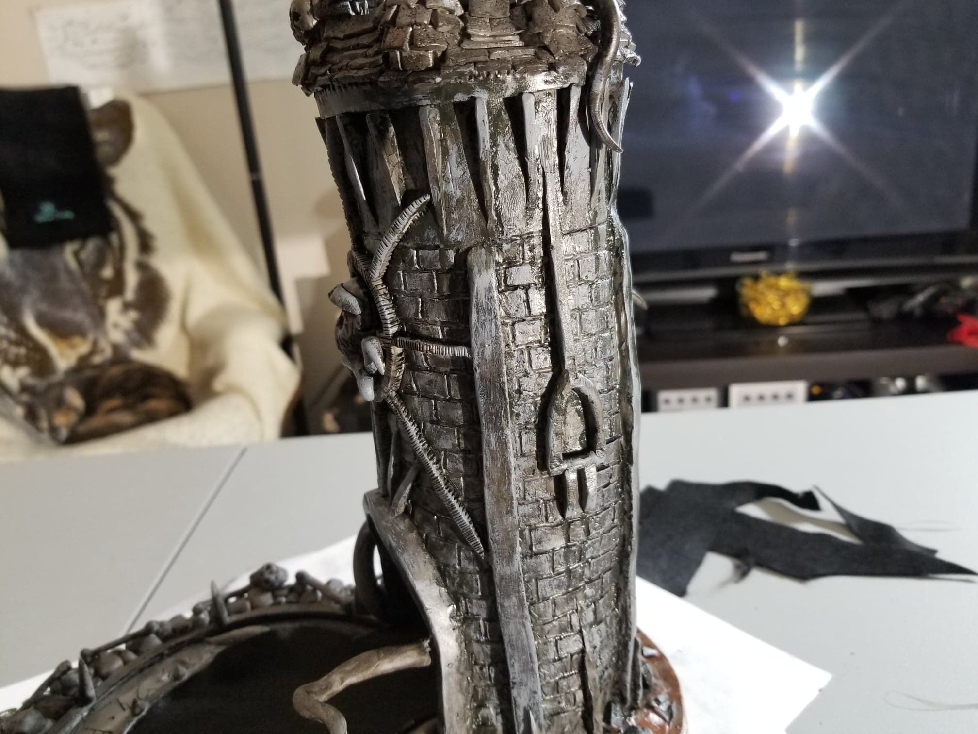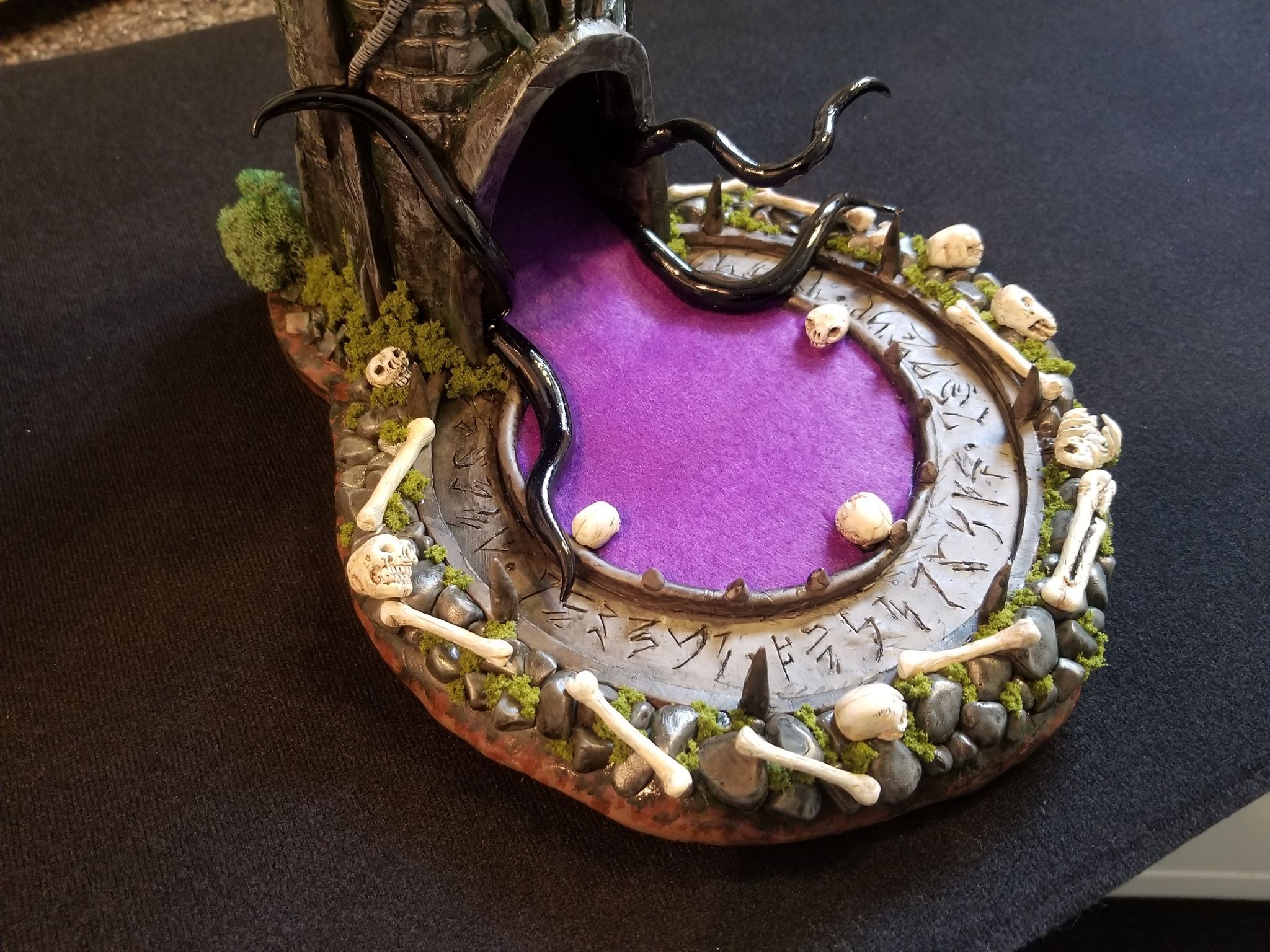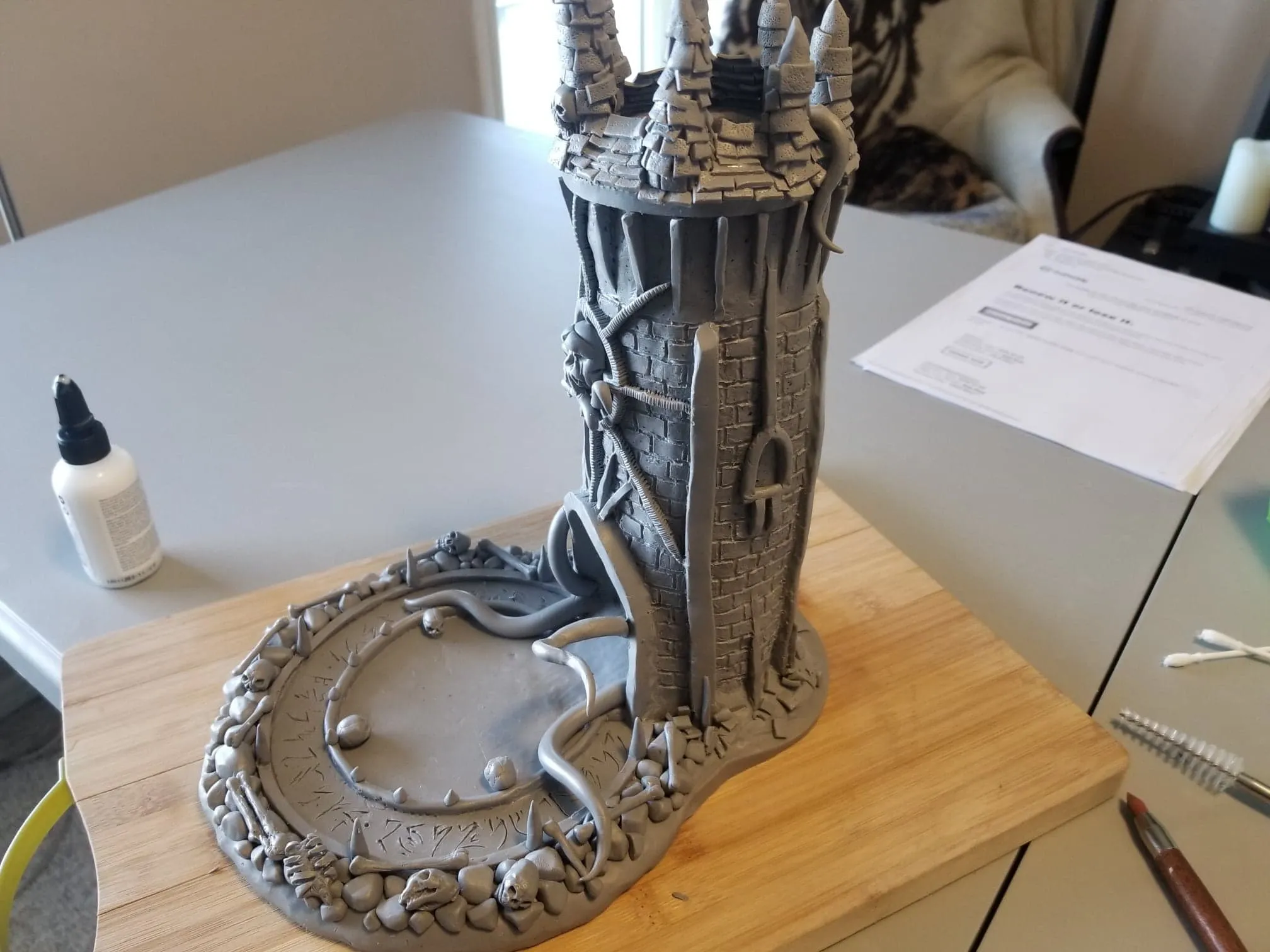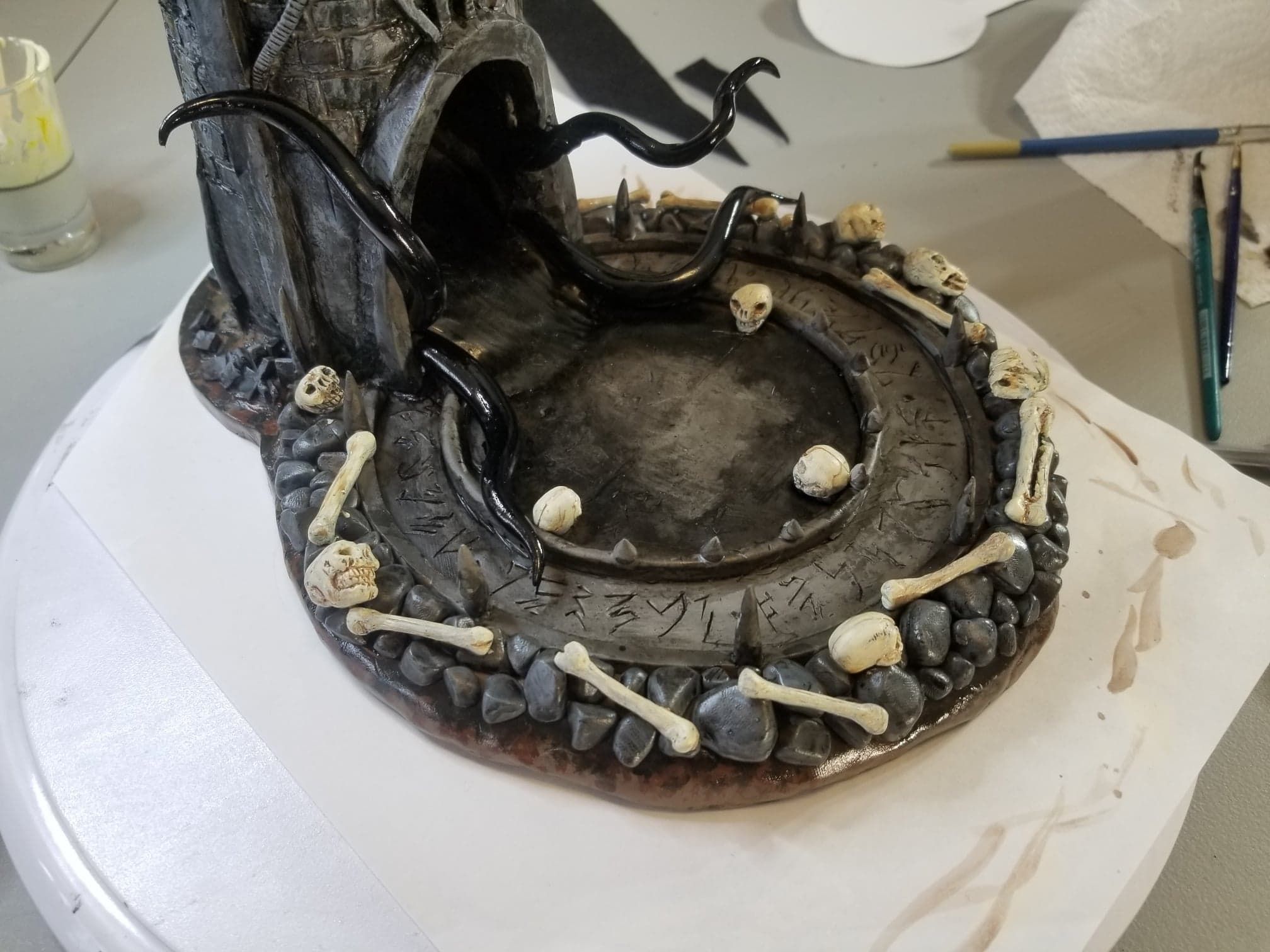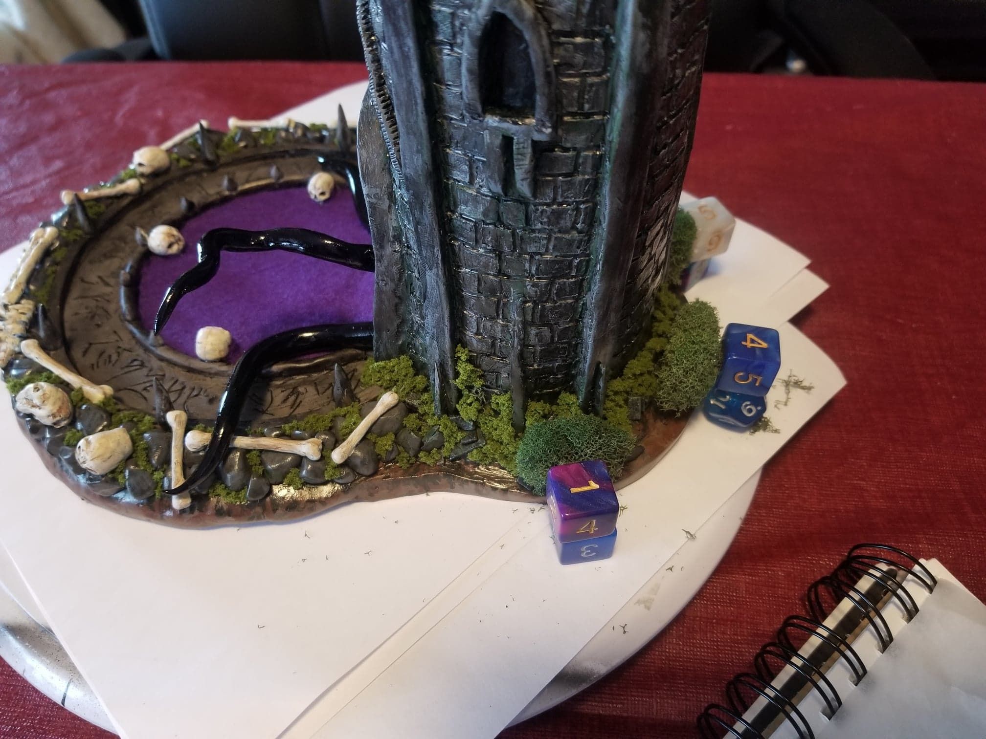 Once again working from insider my head (instead of a proper rough sketch to ease my future frustration) I dove right in with a batch of sculpting tools, a roll of chicken-wire, and a dream (lol). Of course I’m a big fan of the H.P. Lovecraft ‘Cthulhu’ mythos, horror in general, and wanted to incorporate a batch of my interests in one fell swoop. This dice tower is the result.