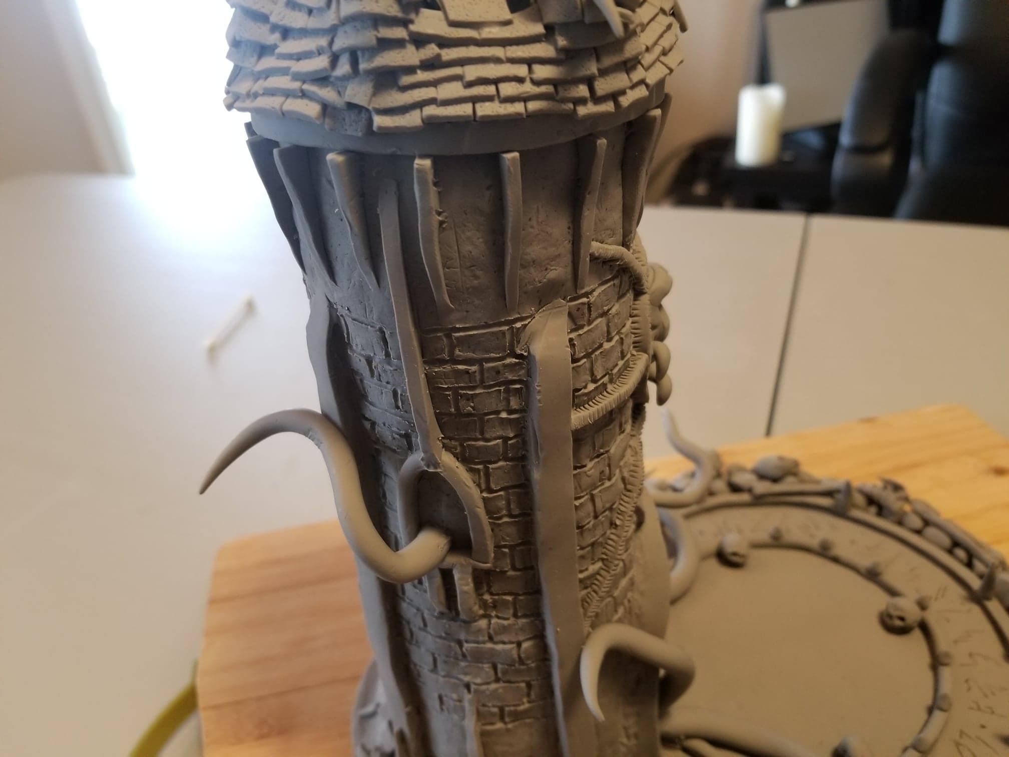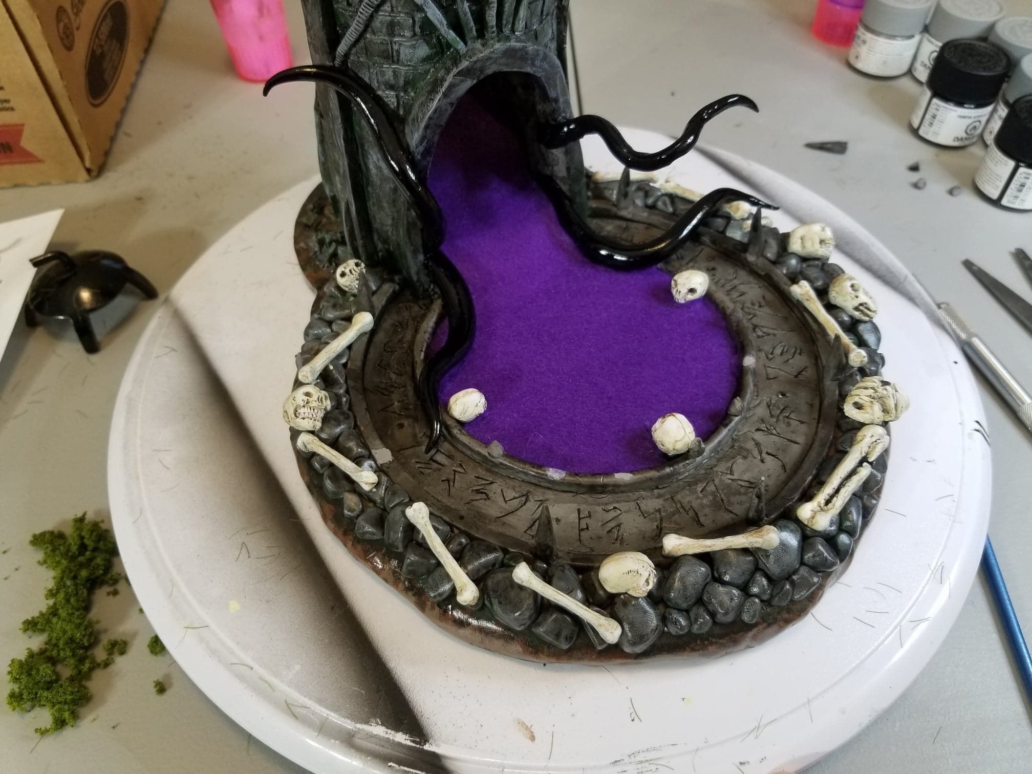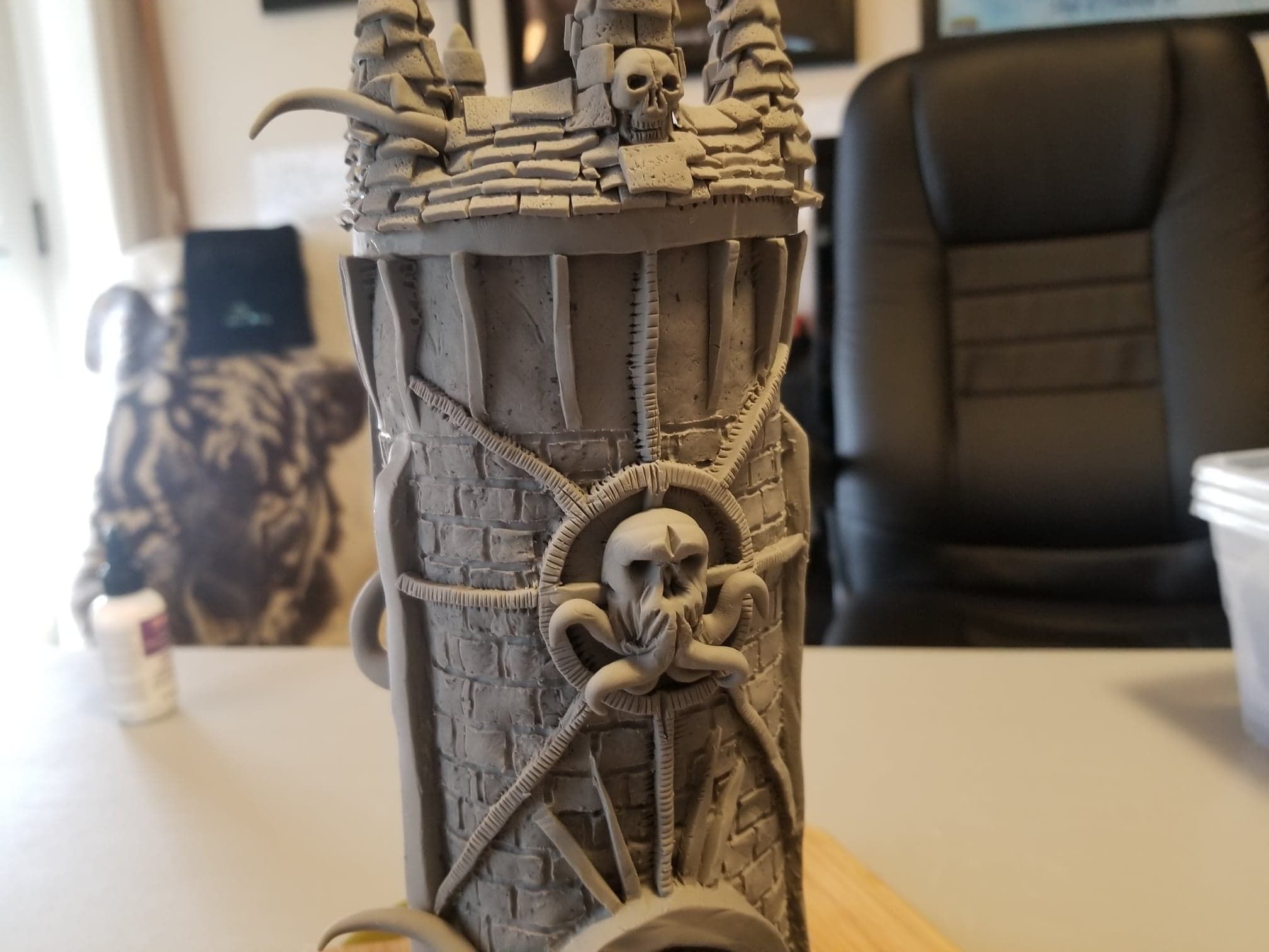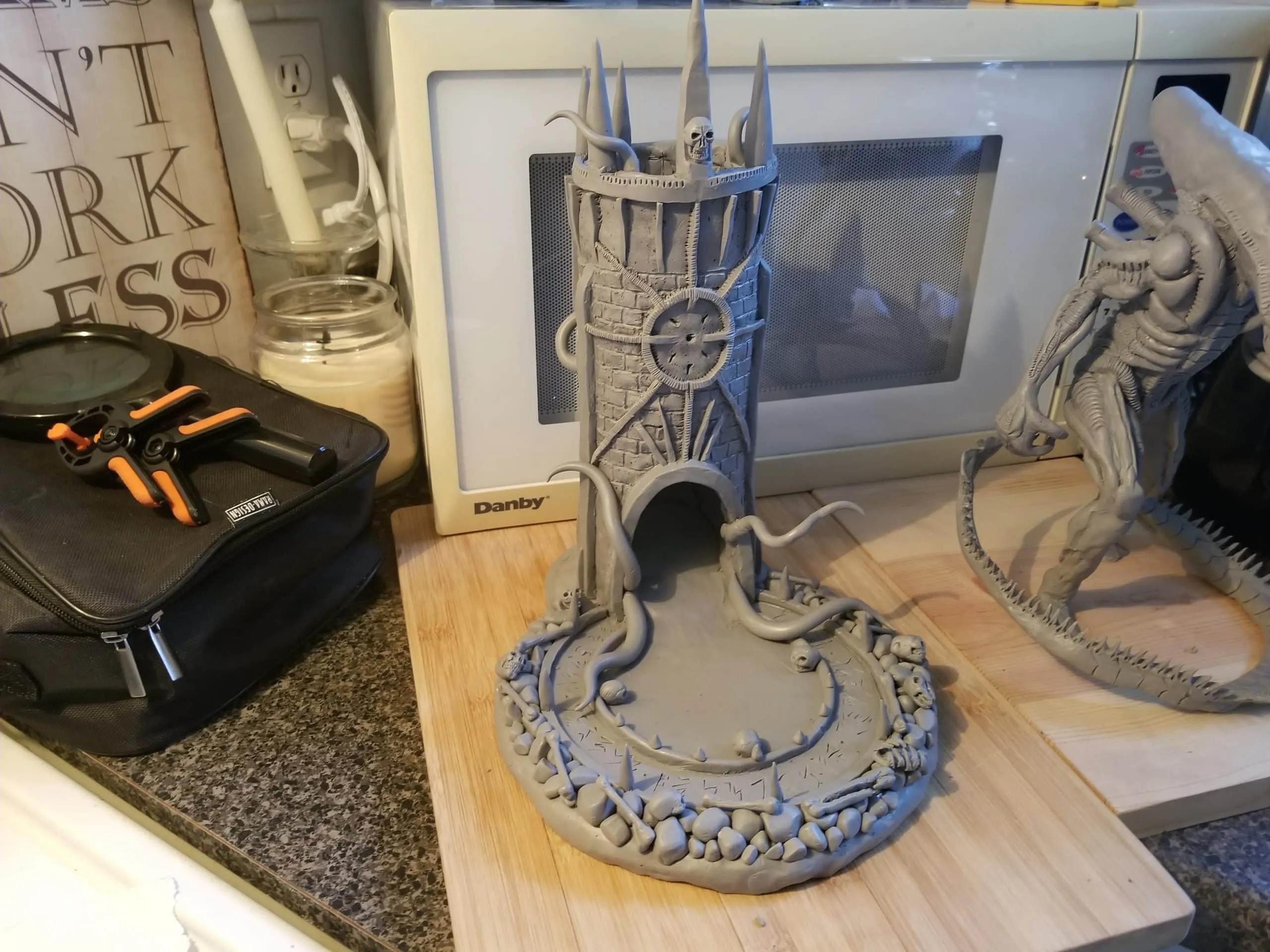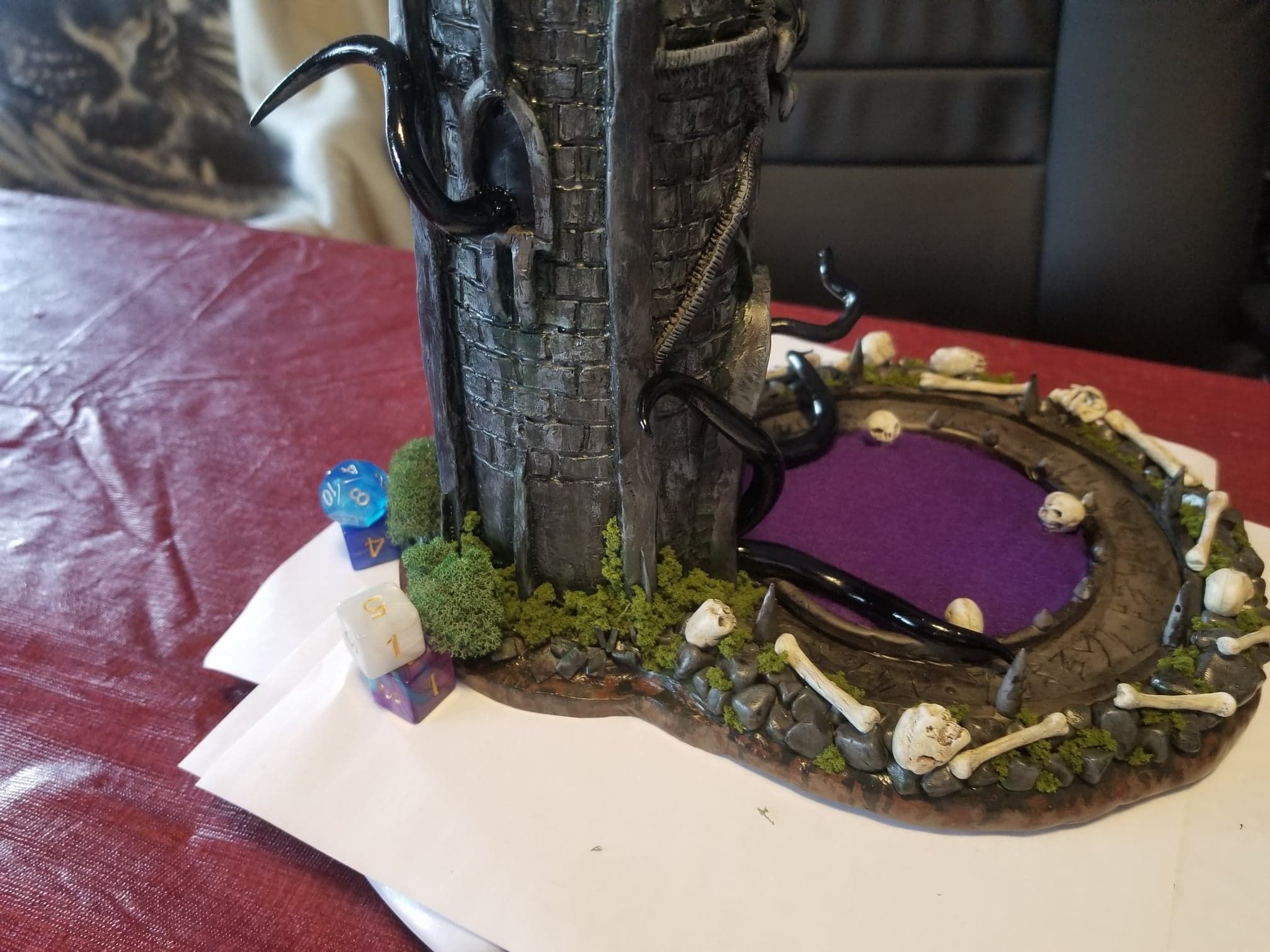 Once again working from insider my head (instead of a proper rough sketch to ease my future frustration) I dove right in with a batch of sculpting tools, a roll of chicken-wire, and a dream (lol). Of course I’m a big fan of the H.P. Lovecraft ‘Cthulhu’ mythos, horror in general, and wanted to incorporate a batch of my interests in one fell swoop. This dice tower is the result.
