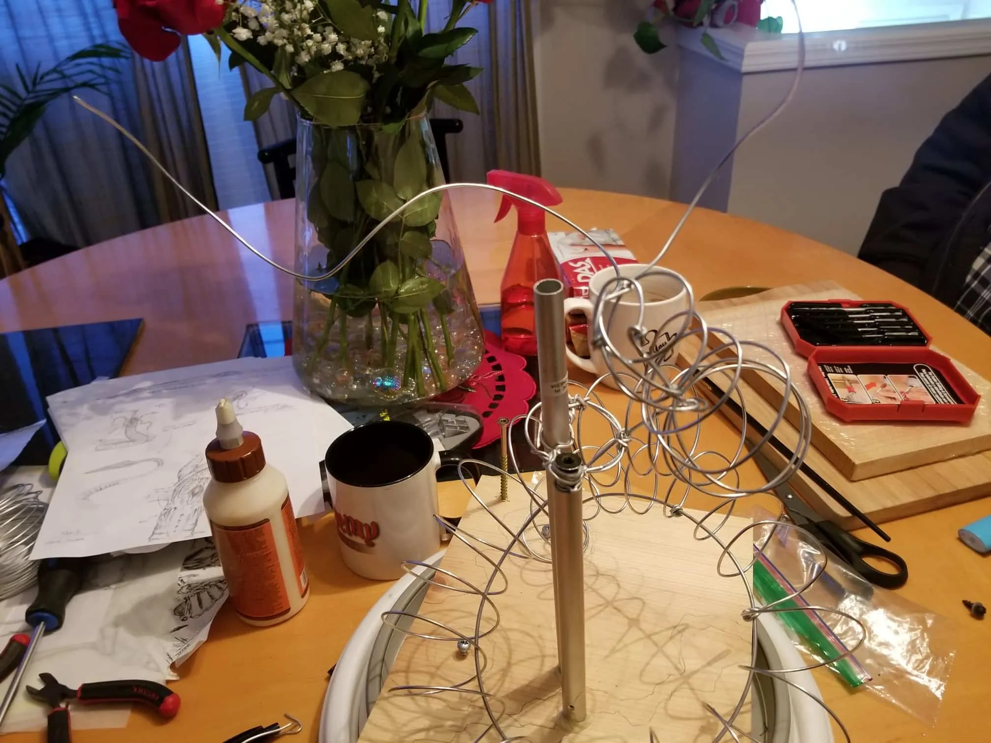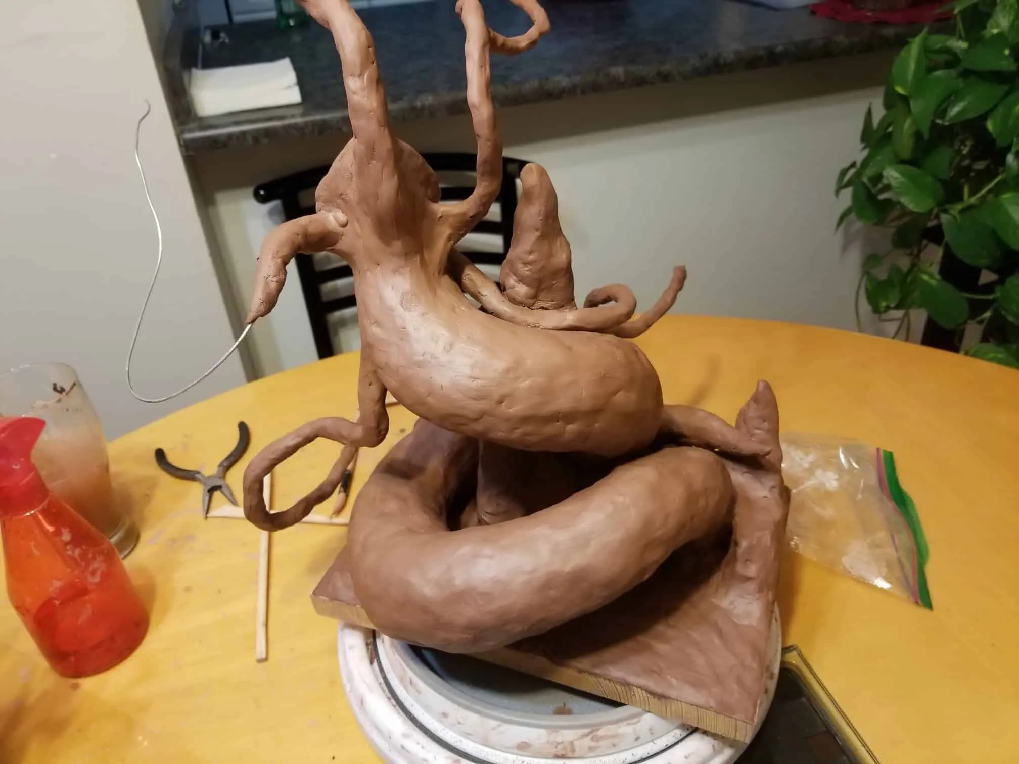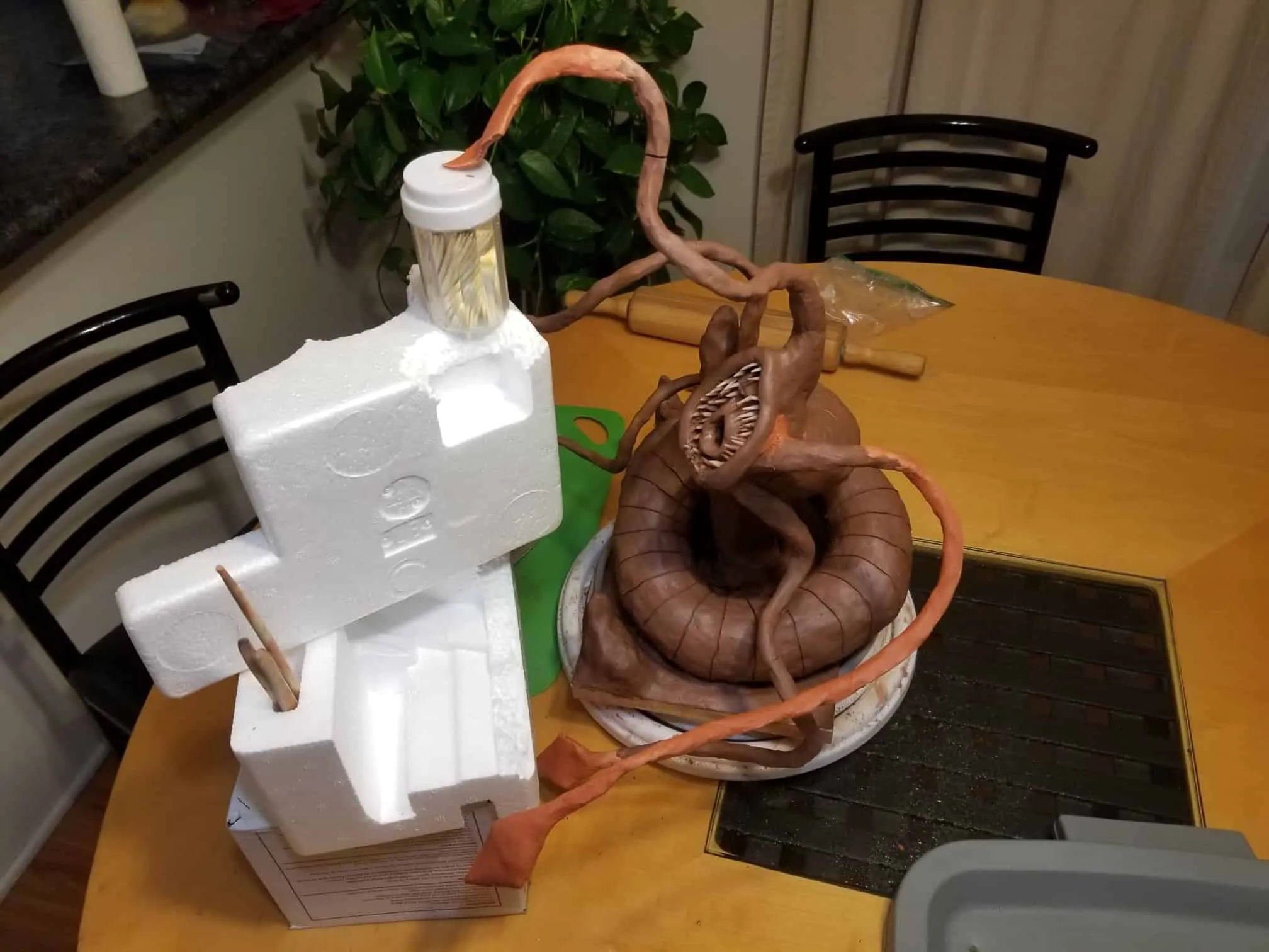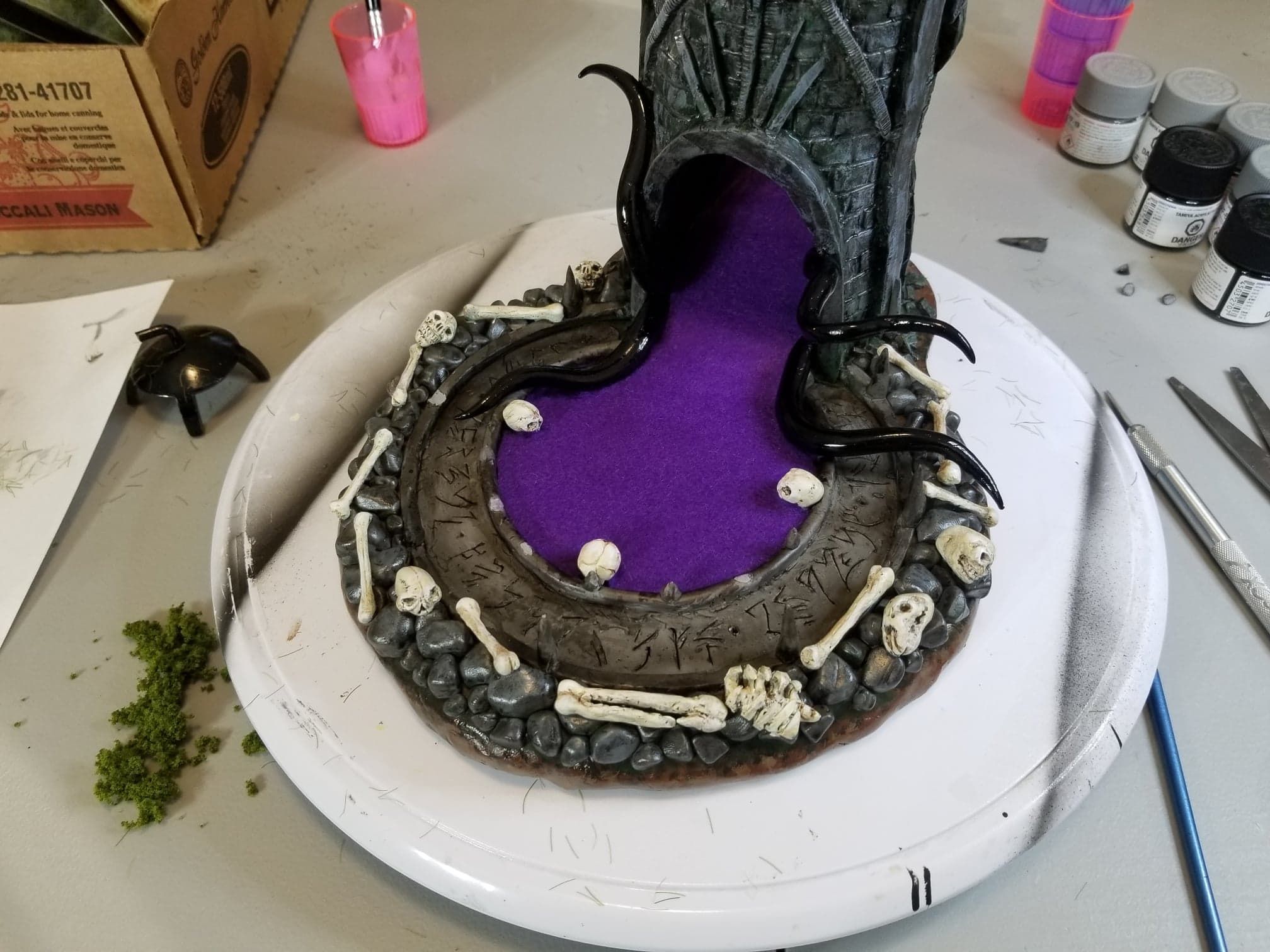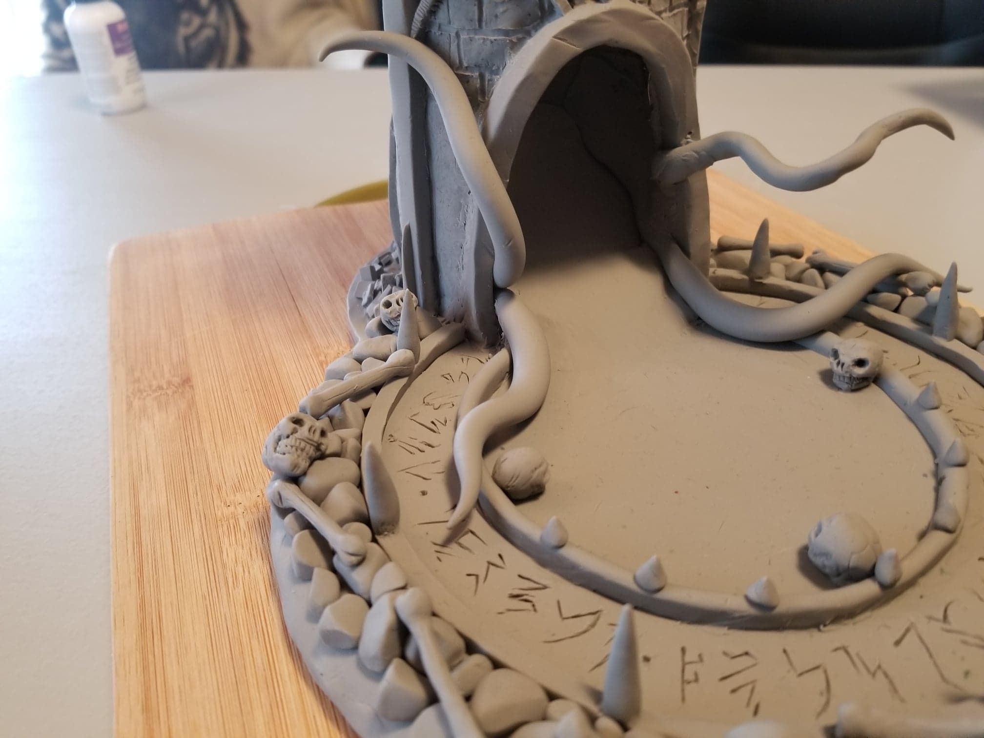 Once again working from insider my head (instead of a proper rough sketch to ease my future frustration) I dove right in with a batch of sculpting tools, a roll of chicken-wire, and a dream (lol). Of course I’m a big fan of the H.P. Lovecraft ‘Cthulhu’ mythos, horror in general, and wanted to incorporate a batch of my interests in one fell swoop. This dice tower is the result.
