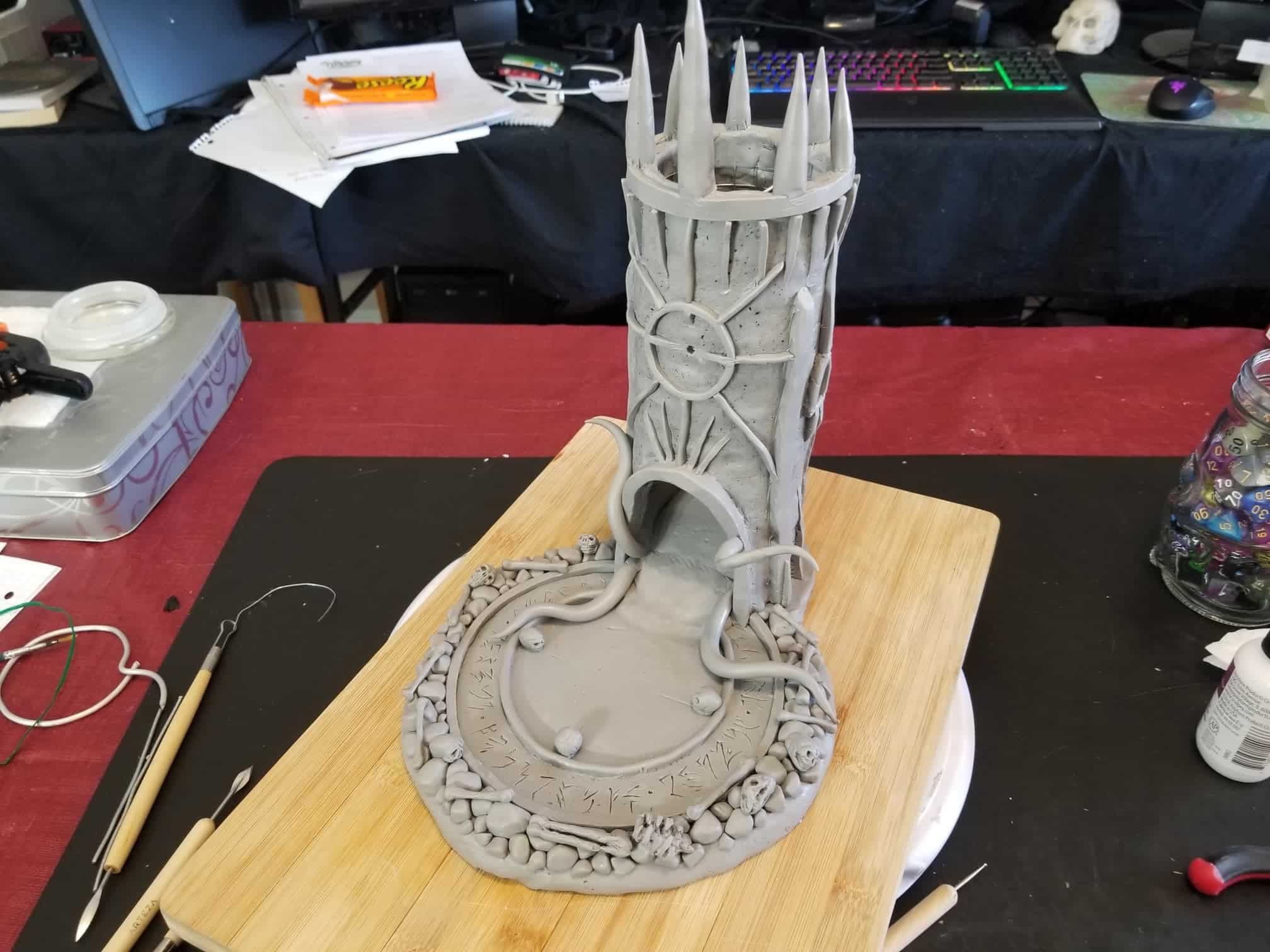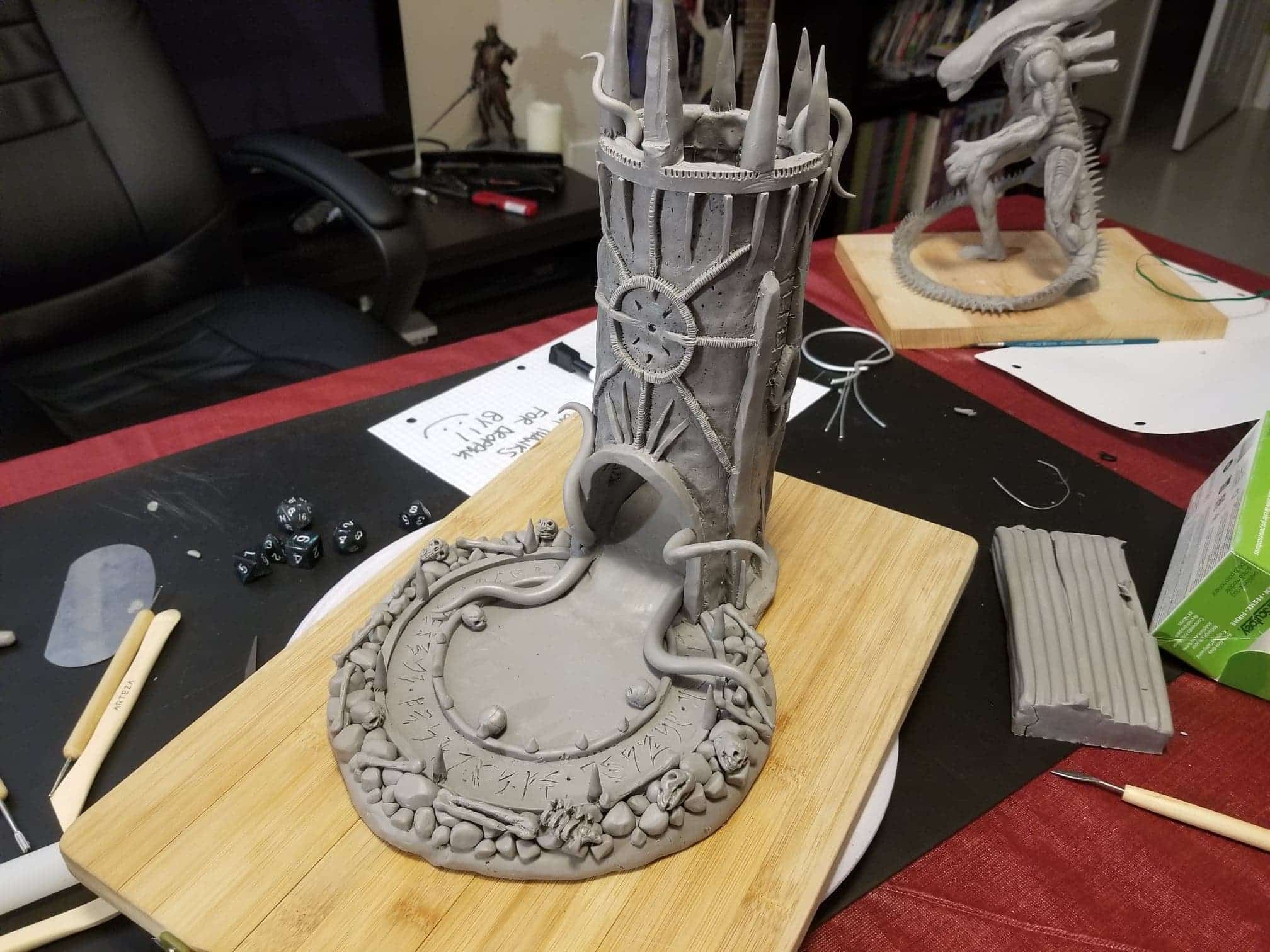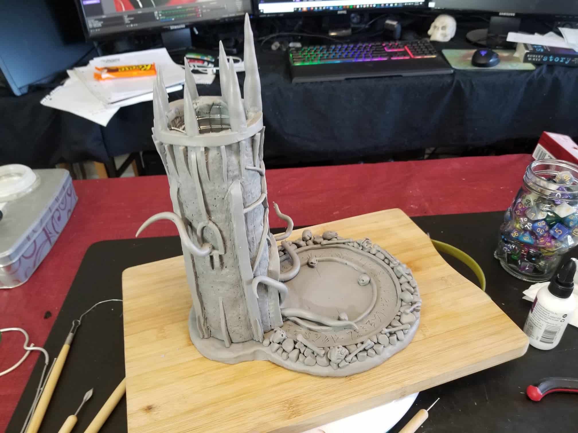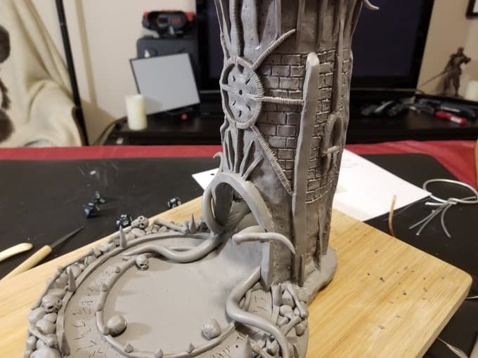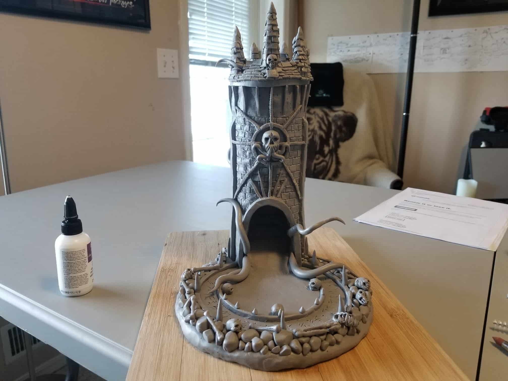 This dice tower (for tabletop role-playing games like Dungeons & Dragons®) was actually the first clay sculpture constructed using Sculpey® and using a wire mesh (that counts, right?). I looked online for a dice tower I could be proud to own and although there are several really nice options out there, I felt compelled to create my own. How hard could it be, right? Seriously, it was one heck of a learning process.