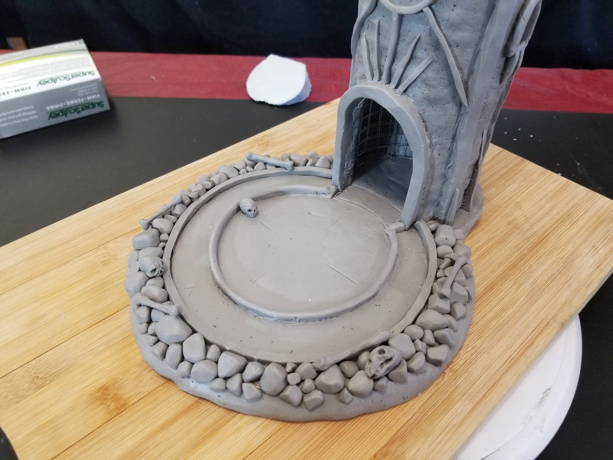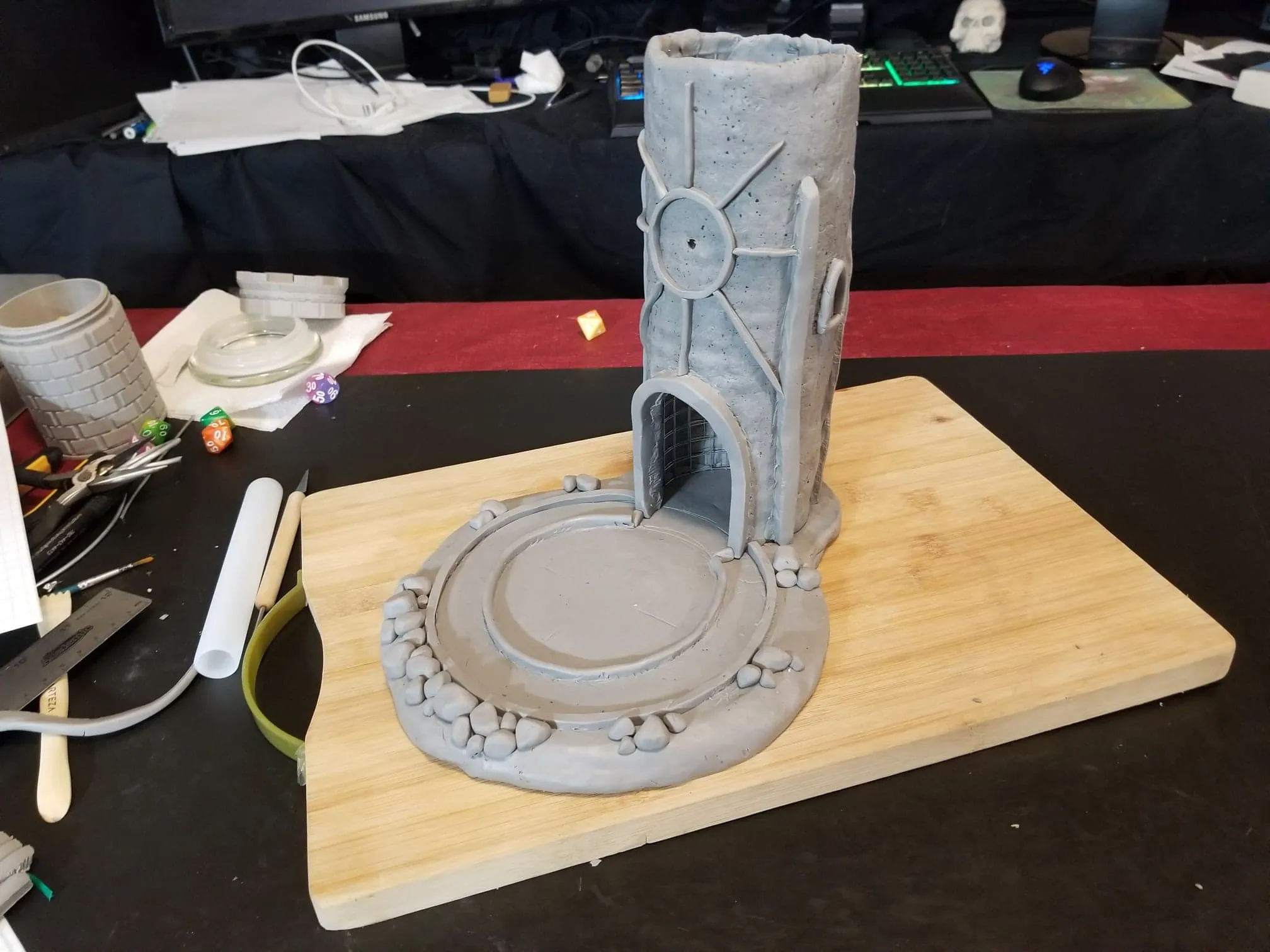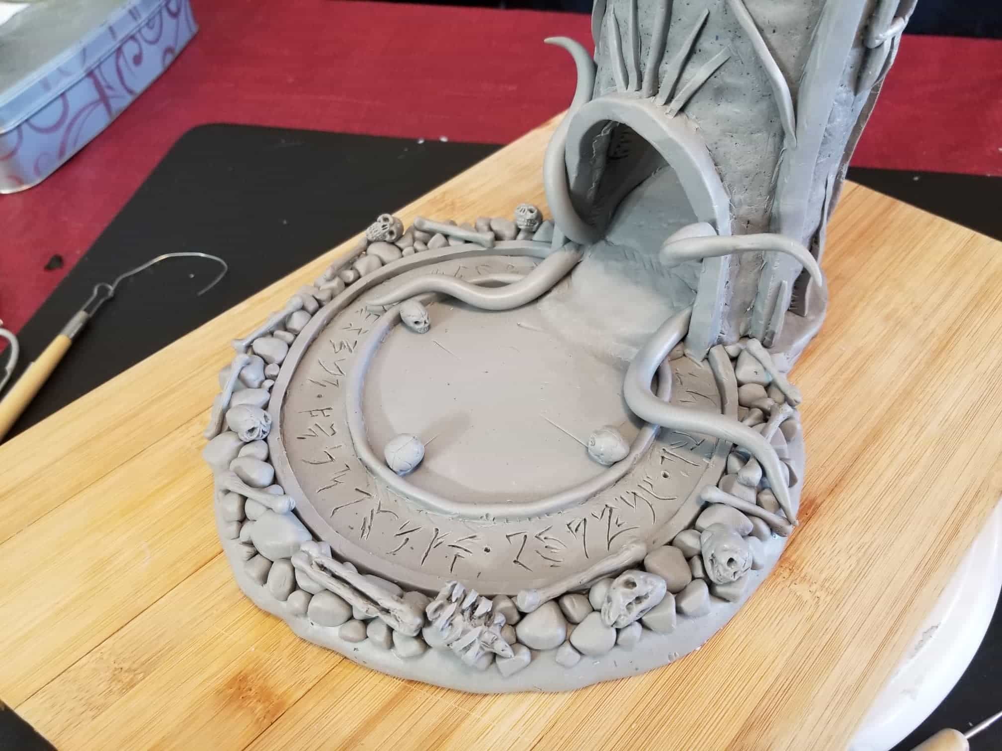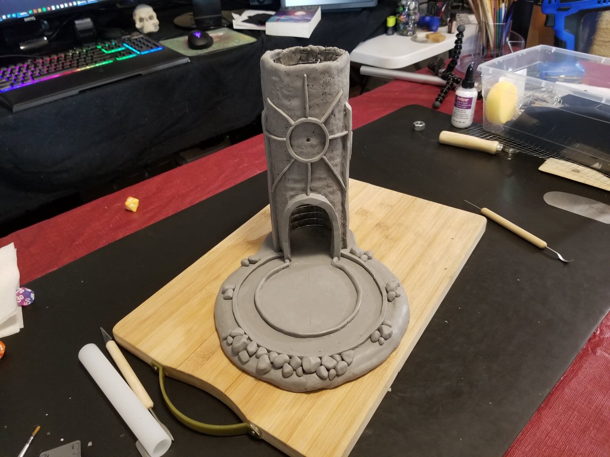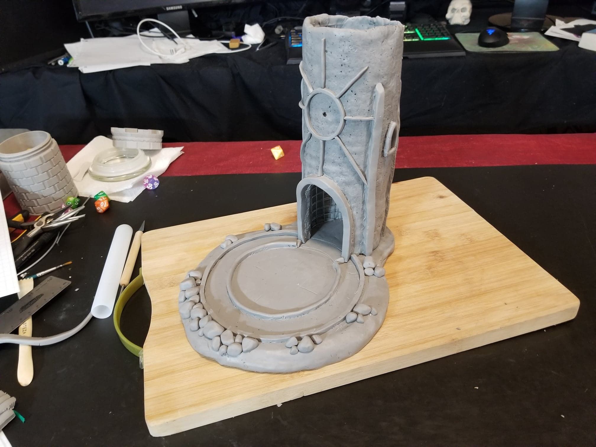 This dice tower (for tabletop role-playing games like Dungeons & Dragons®) was actually the first clay sculpture constructed using Sculpey® and using a wire mesh (that counts, right?). I looked online for a dice tower I could be proud to own and although there are several really nice options out there, I felt compelled to create my own. How hard could it be, right? Seriously, it was one heck of a learning process.